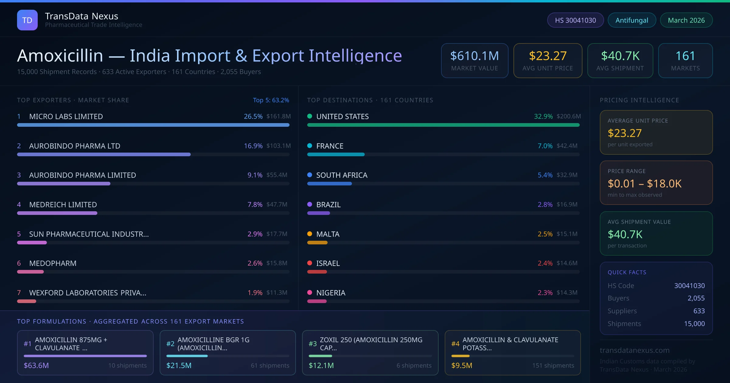 Between 2022 and 2026, India exported $610.1M worth of amoxicillin across 15,000 verified shipments to 161 countries — covering 83% of world markets in the Antibiotics segment. The largest destination is UNITED STATES (32.9%). MICRO LABS LIMITED leads with a 26.5% share. All figures are drawn from Indian Customs (DGFT) shipping bill records spanning four years of trade activity.