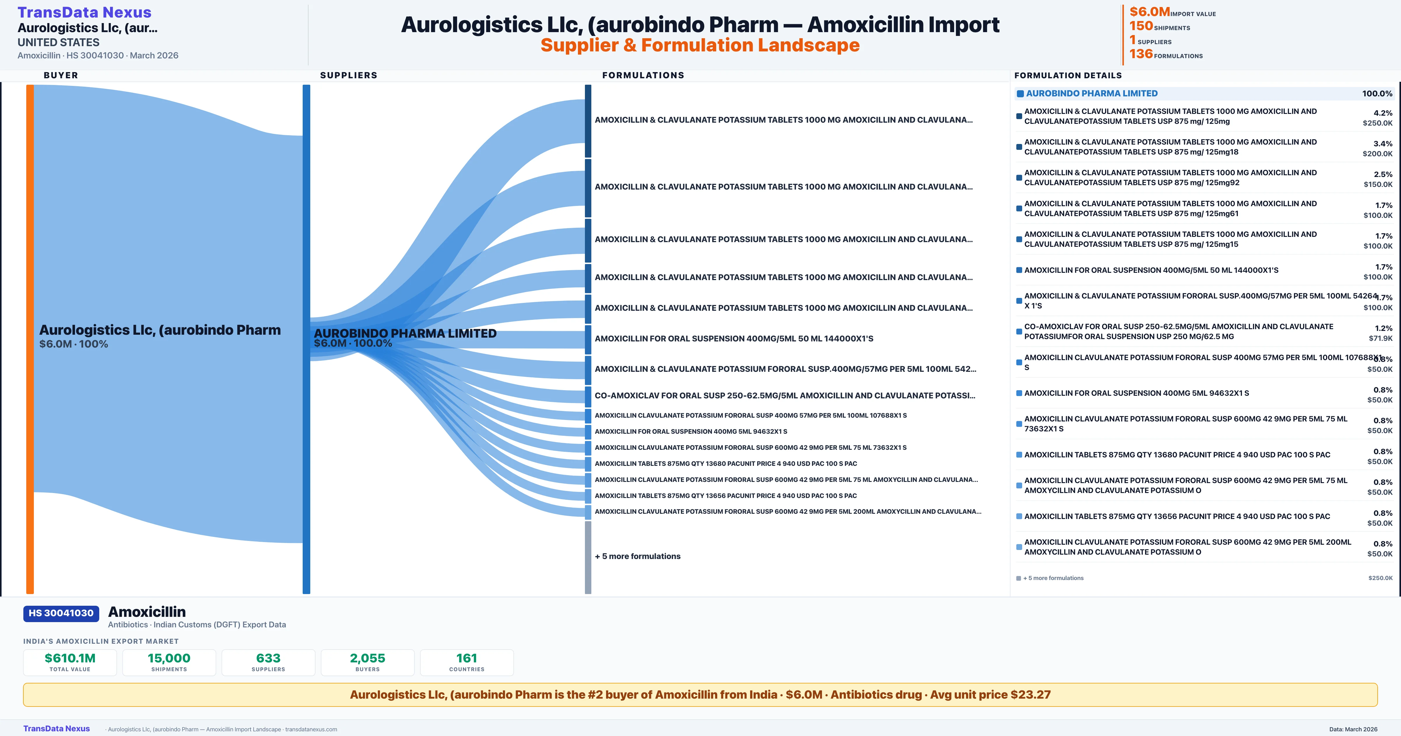 AUROLOGISTICS LLC AUROBINDO PHARM sources Amoxicillin from 1 verified Indian supplier: AUROBINDO PHARMA LIMITED ($6.0M, 100.0%). This is based on 150 customs records.