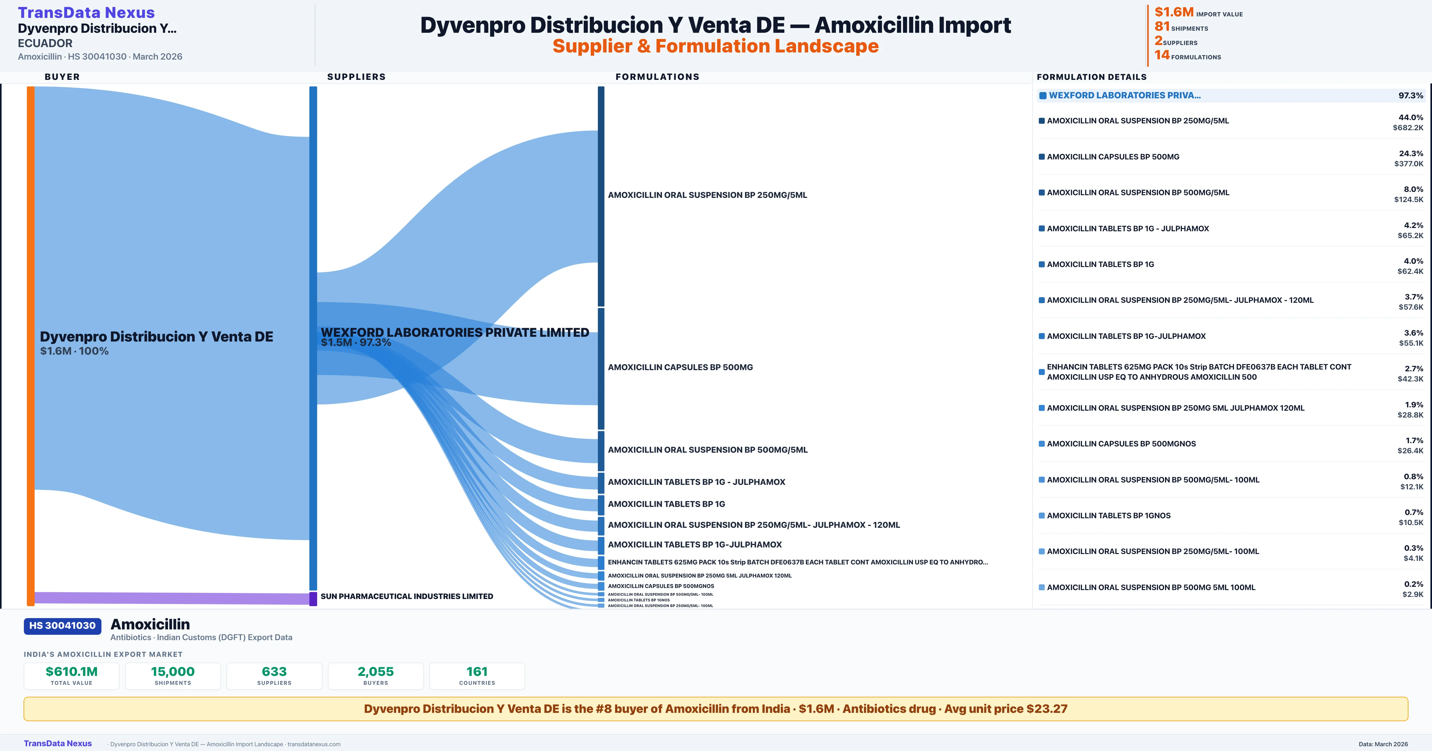 India exported $97.2M worth of Amoxicillin through 15,000 shipments from 633 suppliers to 161 countries, serving 2,055 buyers globally. DYVENPRO DISTRIBUCION Y VENTA DE imports $1.6M of this total, accounting for 0.5% of India's Amoxicillin exports with 81 shipments from ECUADOR. This is verified from 81 customs shipment records covering 14 distinct formulations.