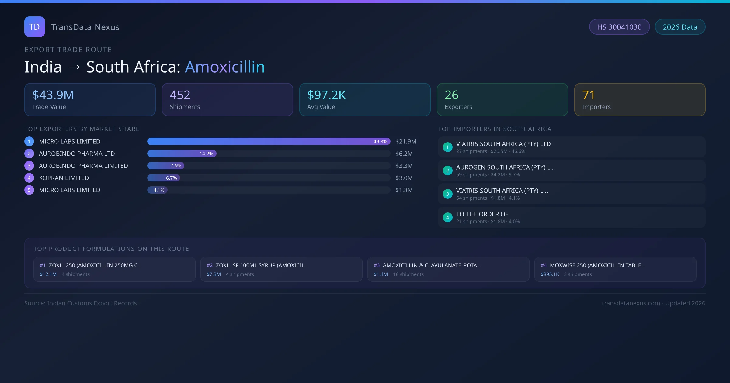 India has recorded 452 verified shipments of Amoxicillin exported to South Africa, representing a combined trade value of $43.9M USD. This corridor is served by 26 active Indian exporters, with an average shipment value of $97.2K USD. The leading Indian exporter is MICRO LABS LIMITED, which accounts for 50% of total export value with 62 shipments worth $21.9M USD. On the buying side, VIATRIS SOUTH AFRICA (PTY) LTD is the largest importer in South Africa with $20.5M USD in purchases. The top 3 suppliers — MICRO LABS LIMITED, AUROBINDO PHARMA LTD, AUROBINDO PHARMA LIMITED — together control 72% of total trade value on this route. All data sourced from Indian Customs (DGFT) shipping bill records. Values reported in FOB USD.