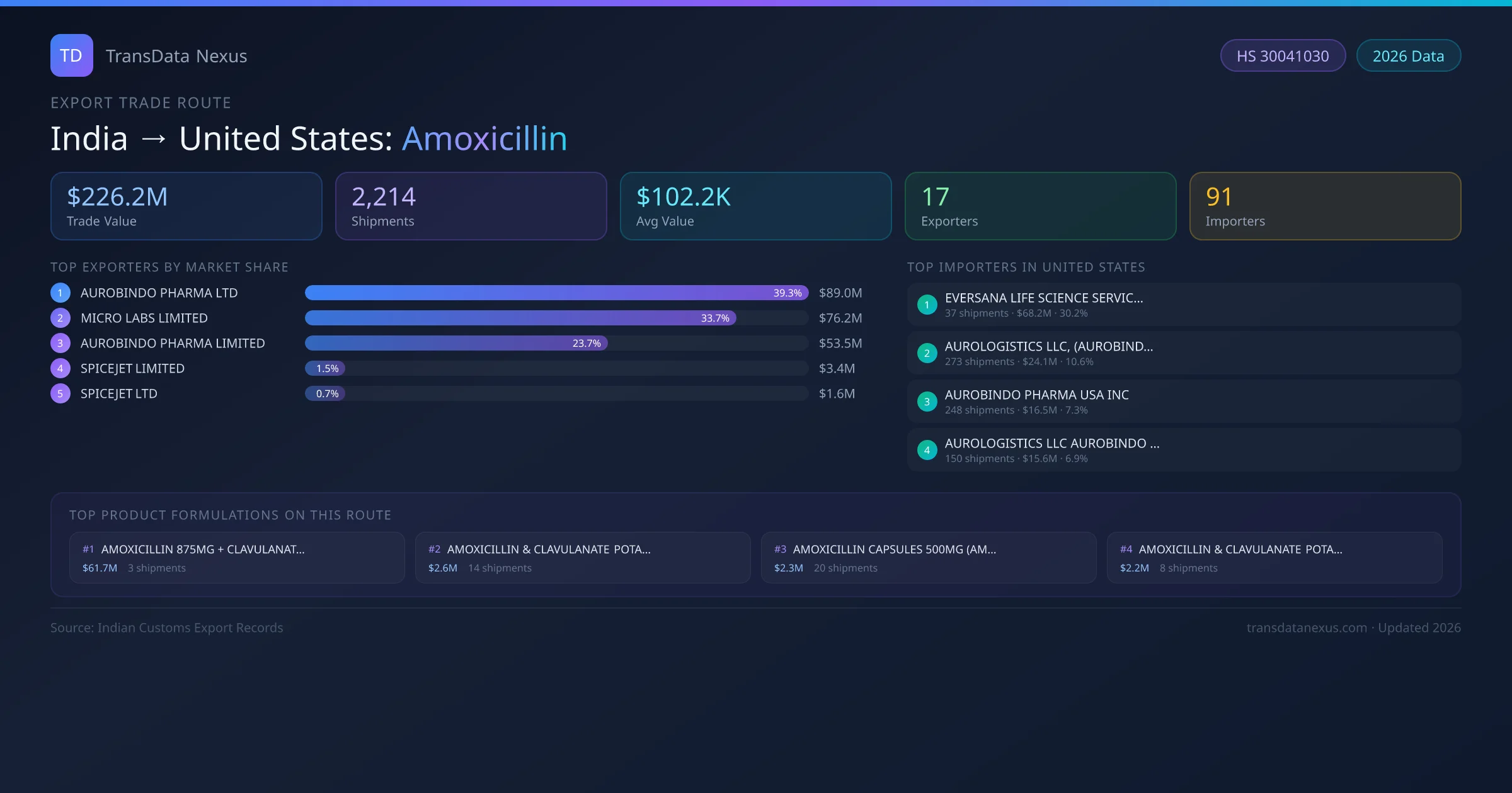 - 1.Route Identification: India to United States export trade corridor identified from Indian Customs (DGFT) records for Amoxicillin.