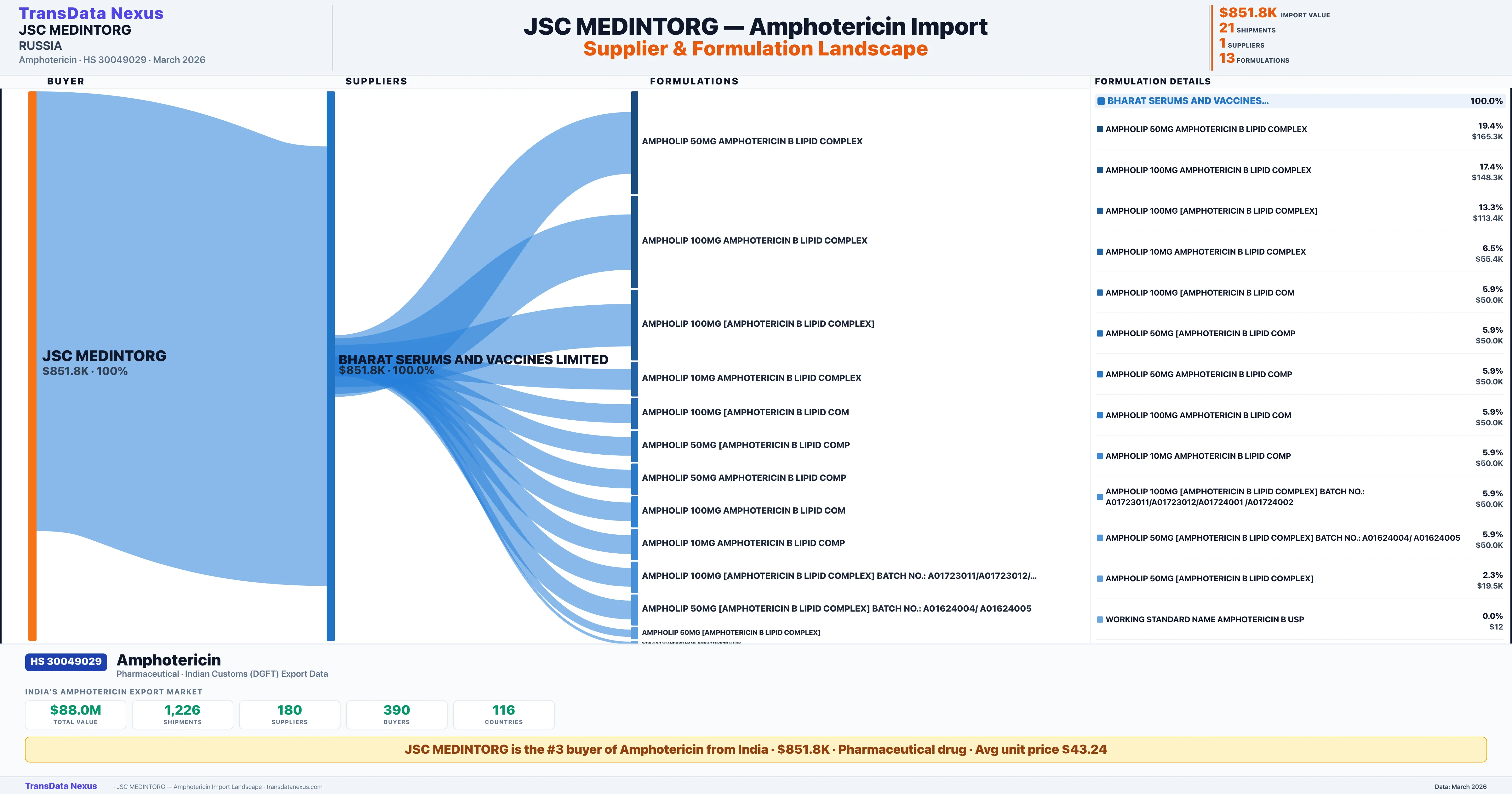 JSC MEDINTORG sources Amphotericin from 1 verified Indian supplier: BHARAT SERUMS AND VACCINES LIMITED ($851.8K, 100.0%). This is based on 21 customs records.