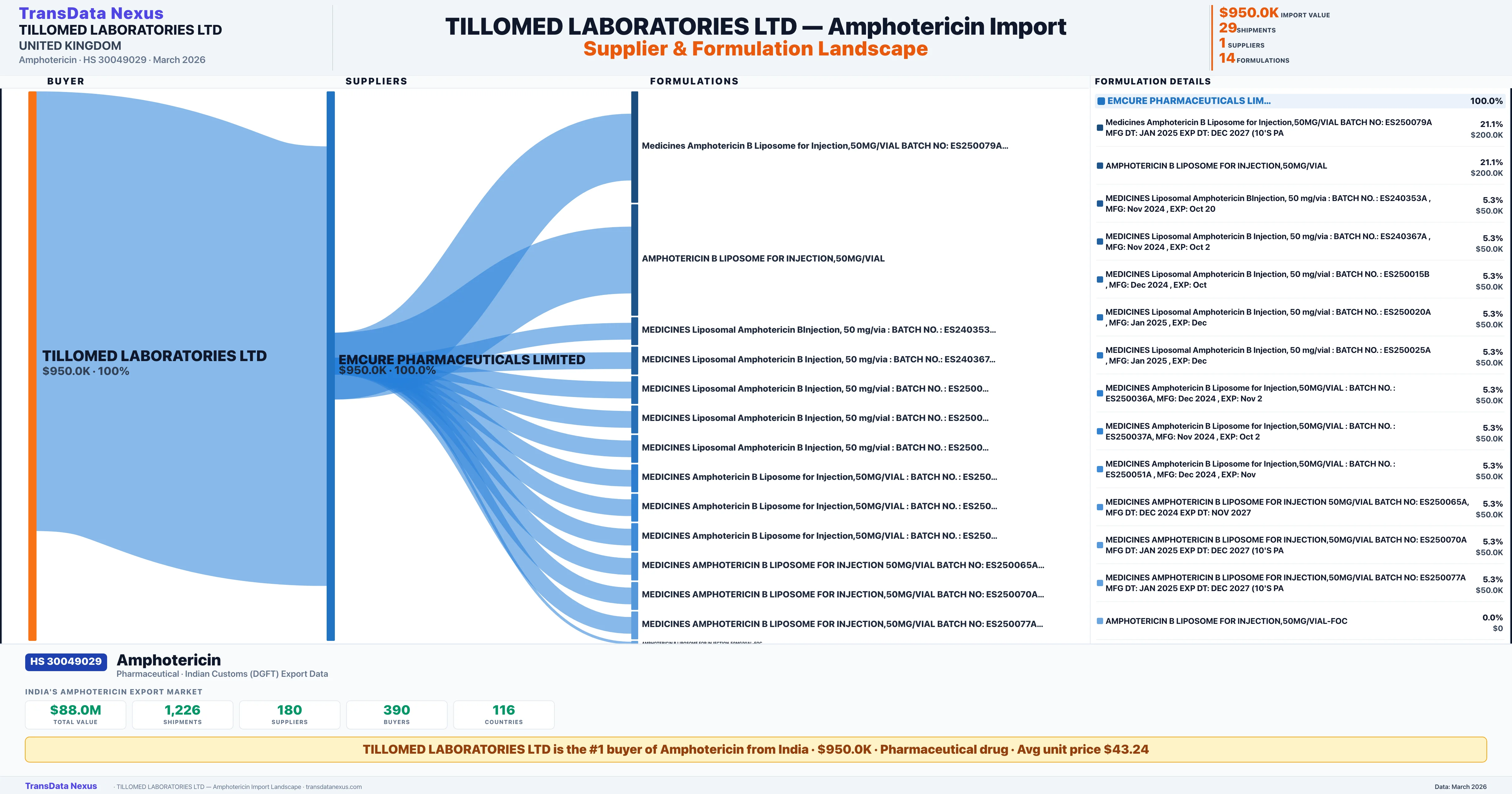 TILLOMED LABORATORIES LTD sources Amphotericin from 1 verified Indian supplier: EMCURE PHARMACEUTICALS LIMITED ($950.0K, 100.0%). This is based on 29 customs records.