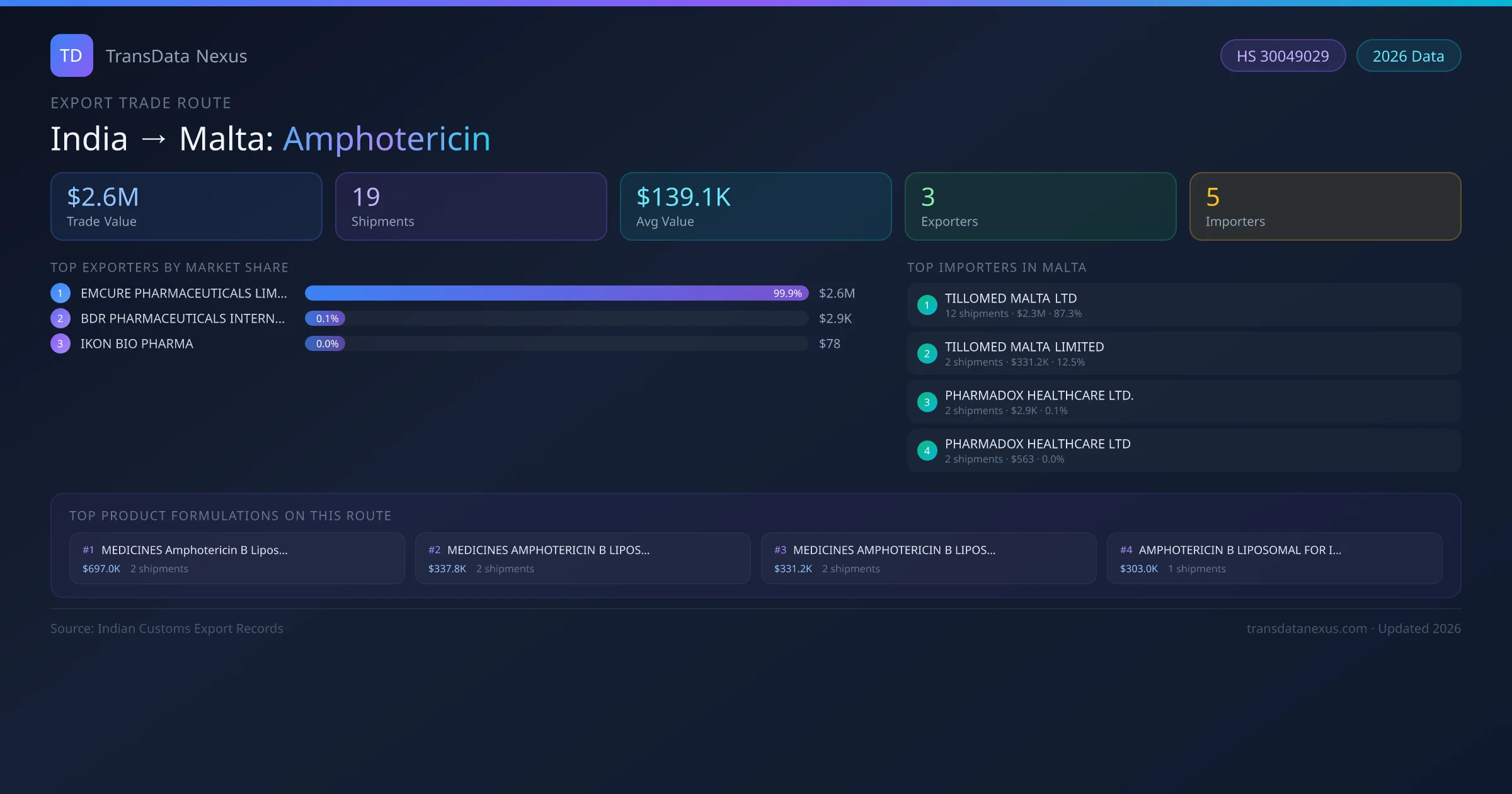 - 1.Route Identification: India to Malta export trade corridor identified from Indian Customs (DGFT) records for Amphotericin.