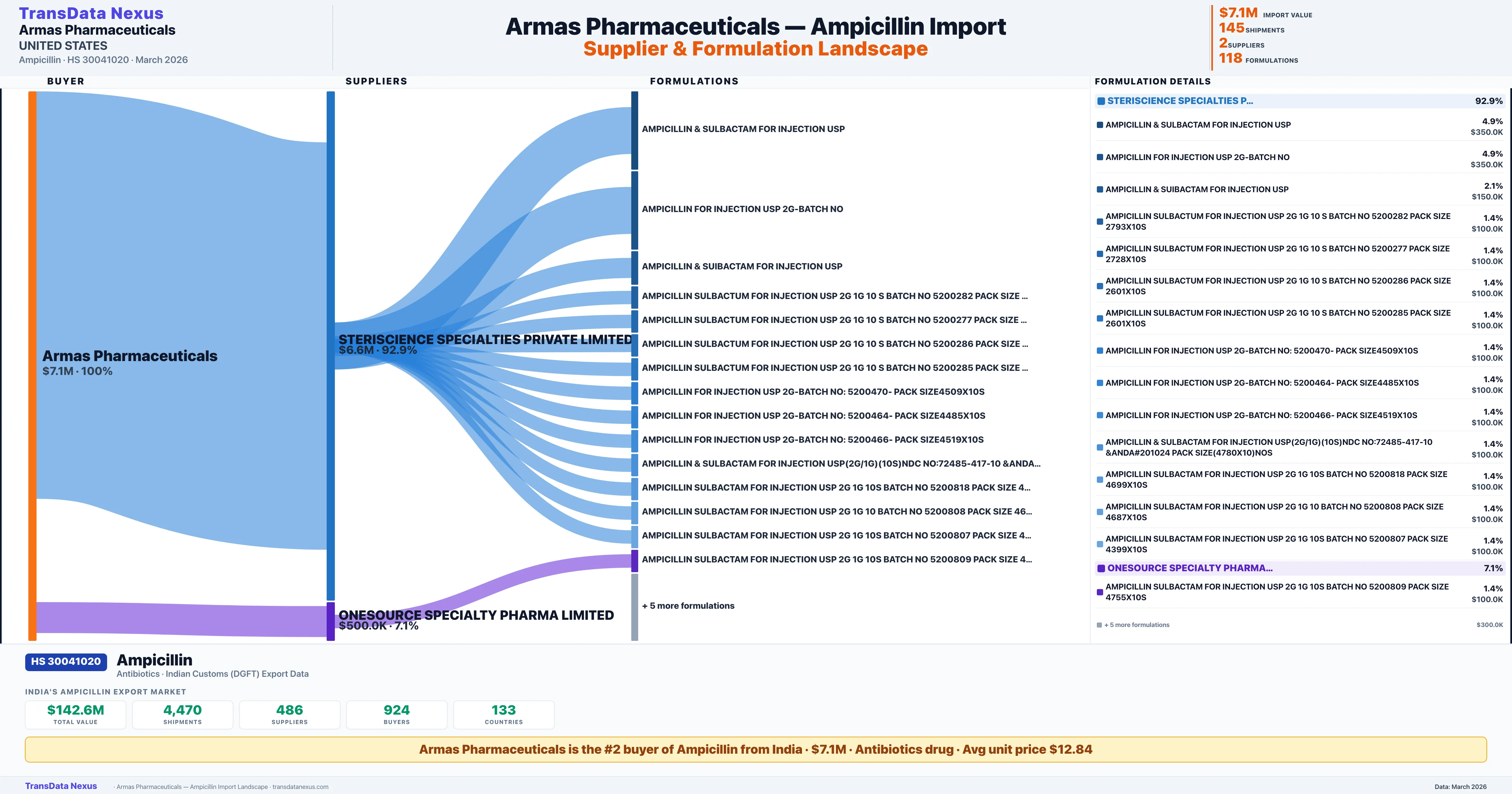 ARMAS PHARMACEUTICALS sources Ampicillin from 2 verified Indian suppliers: STERISCIENCE SPECIALTIES PRIVATE LIMITED ($6.6M, 92.9%), ONESOURCE SPECIALTY PHARMA LIMITED ($500.0K, 7.1%). This is based on 145 customs records.