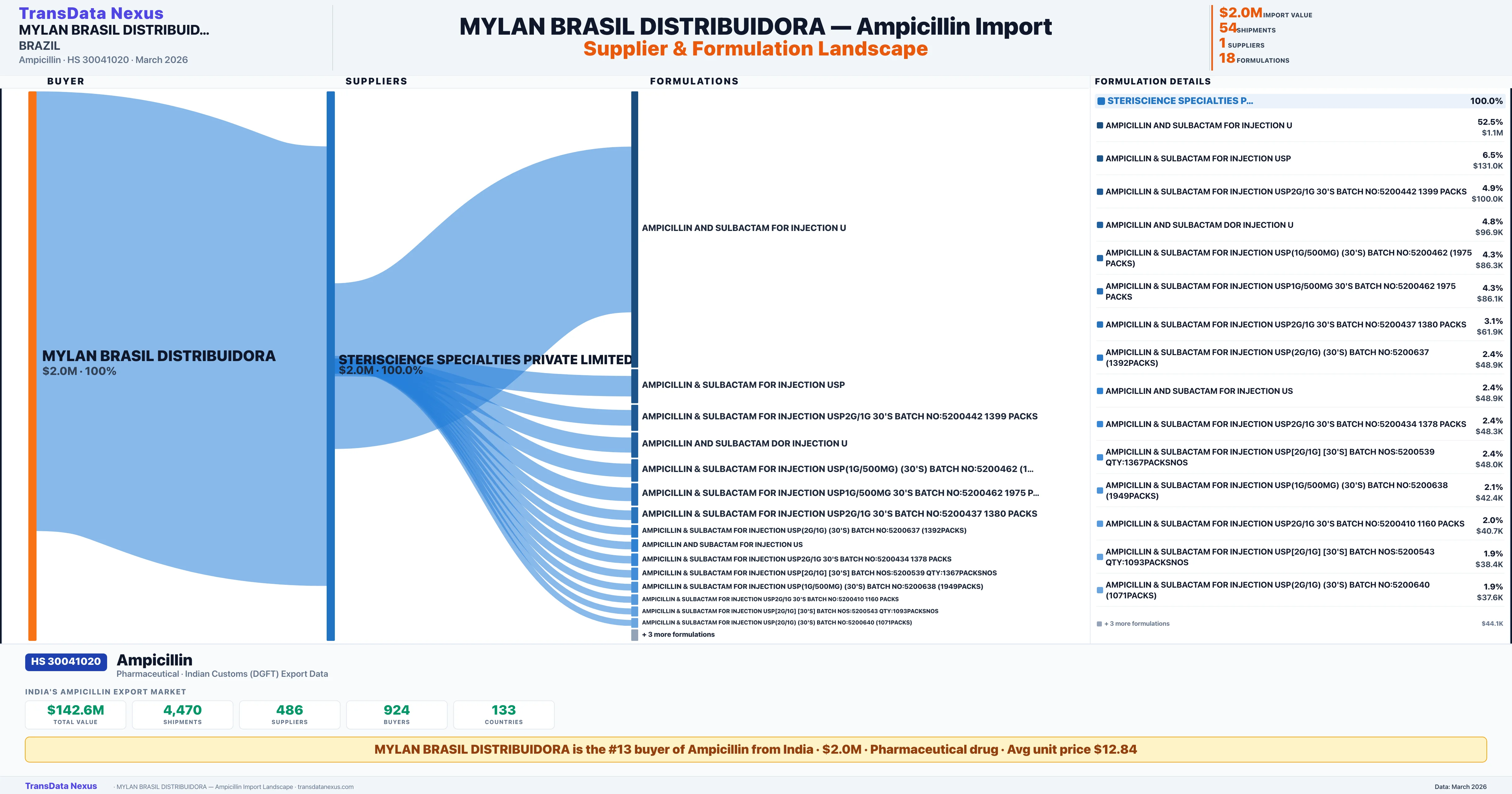 Access order-level details, pricing data, supplier connections, and competitive analysis for MYLAN BRASIL DISTRIBUIDORA's Ampicillin imports. TransData Nexus provides verified Indian Customs (DGFT) data trusted by pharmaceutical trade professionals worldwide.