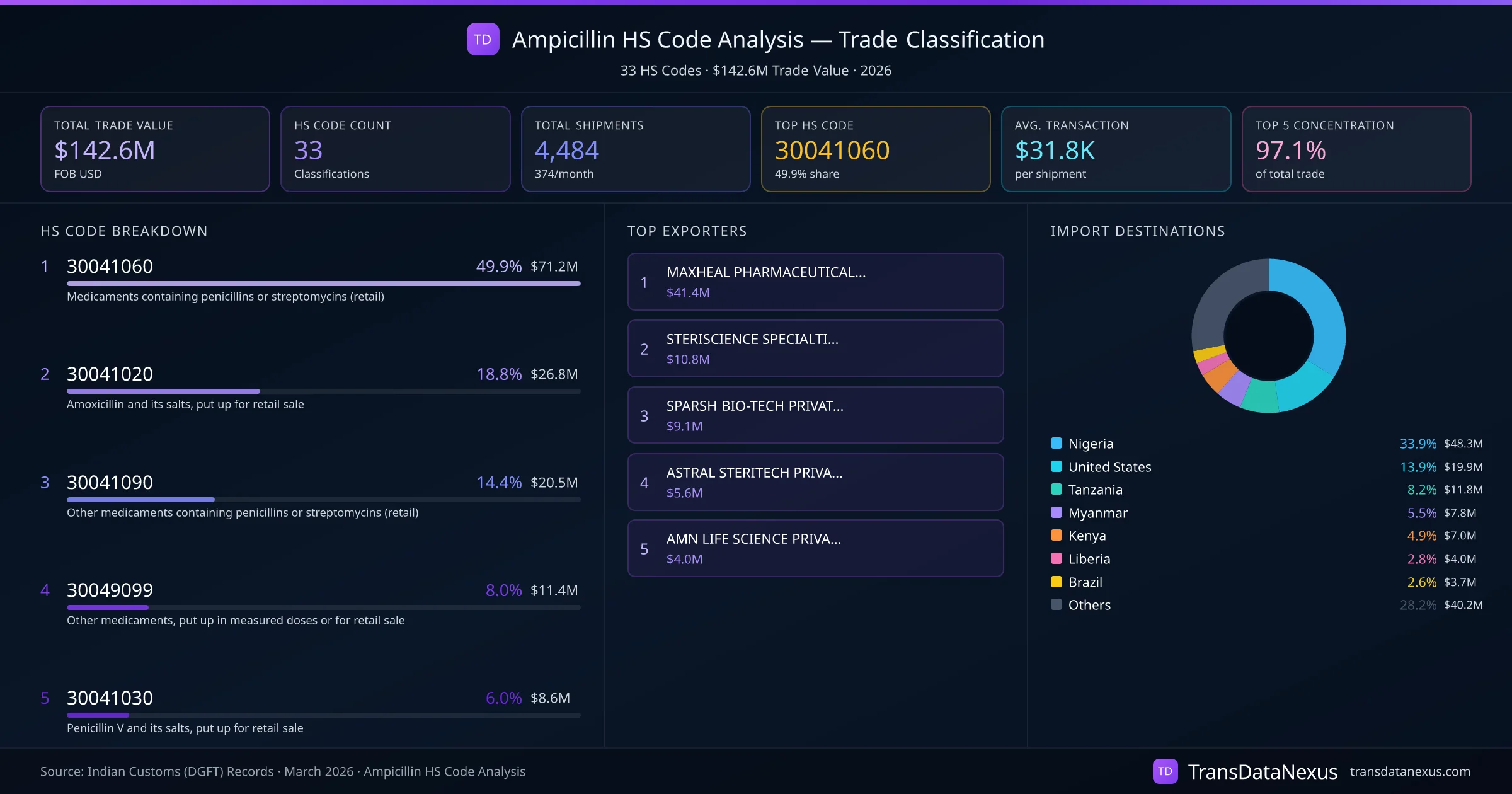 India exports Ampicillin under 33 distinct HS code classifications, representing a total trade value of $142.6M across 4,484 shipments. The dominant classification is HS 30041060 (Medicaments containing penicillins or streptomycins (retail)), accounting for 49.9% of all Ampicillin trade at $71.2M. HS 30041020 (Amoxicillin and its salts, put up for retail sale) follows at 18.8% ($26.8M). The top 5 HS codes together account for 97.1% of total Ampicillin trade from India. The average transaction value is $31806. Key importing markets include Nigeria, United States, Tanzania. Leading exporters include MAXHEAL PHARMACEUTICALS (INDIA) LIMITED and STERISCIENCE SPECIALTIES PRIVATE LIMITED. Data sourced from Indian Customs (DGFT) shipping bill records.