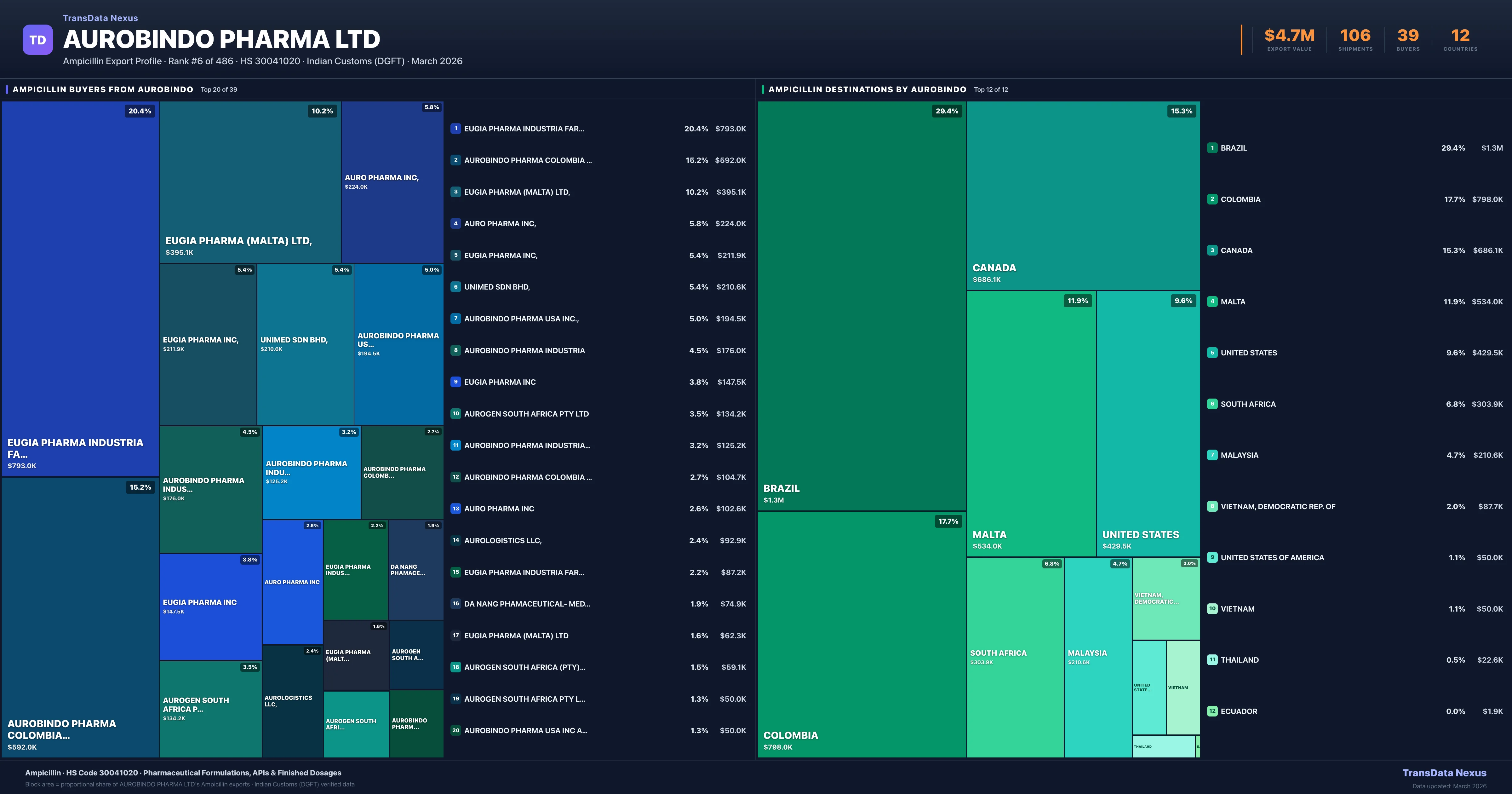Aurobindo Pharma Ltd supplies Ampicillin to 39 buyers globally. The largest buyer is EUGIA PHARMA INDUSTRIA FARMACEUTICA (BRAZIL), followed by AUROBINDO PHARMA COLOMBIA SAS NIT (COLOMBIA) and EUGIA PHARMA (MALTA) LTD, (MALTA). These buyers represent pharmaceutical distributors, hospital groups, and government procurement agencies in their respective markets.