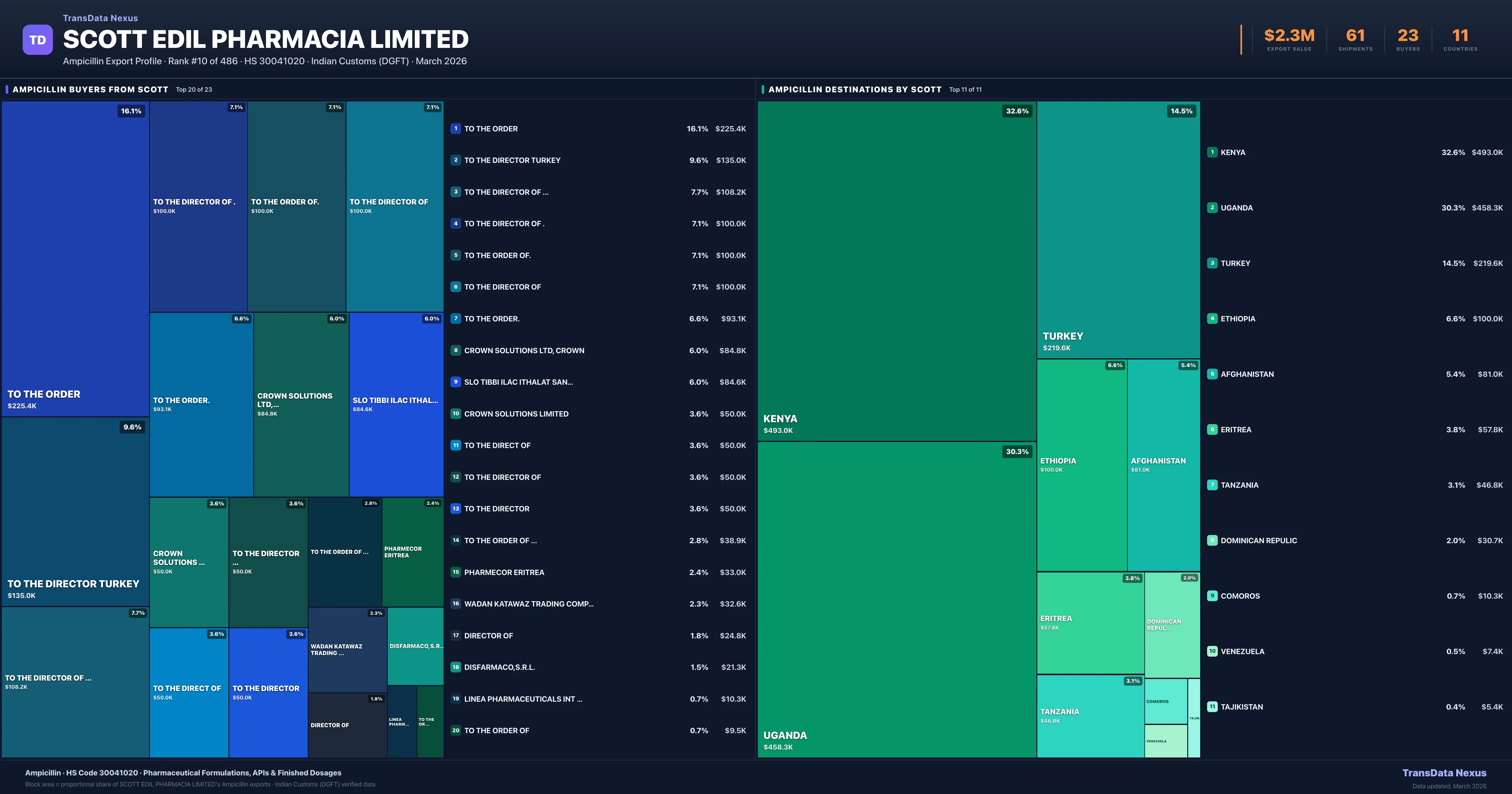 Scott Edil Pharmacia Limited supplies Ampicillin to 23 buyers globally. The largest buyer is TO THE ORDER (TANZANIA), followed by TO THE DIRECTOR TURKEY (TURKEY) and TO THE DIRECTOR OF ... (KENYA). These buyers represent pharmaceutical distributors, hospital groups, and government procurement agencies in their respective markets.