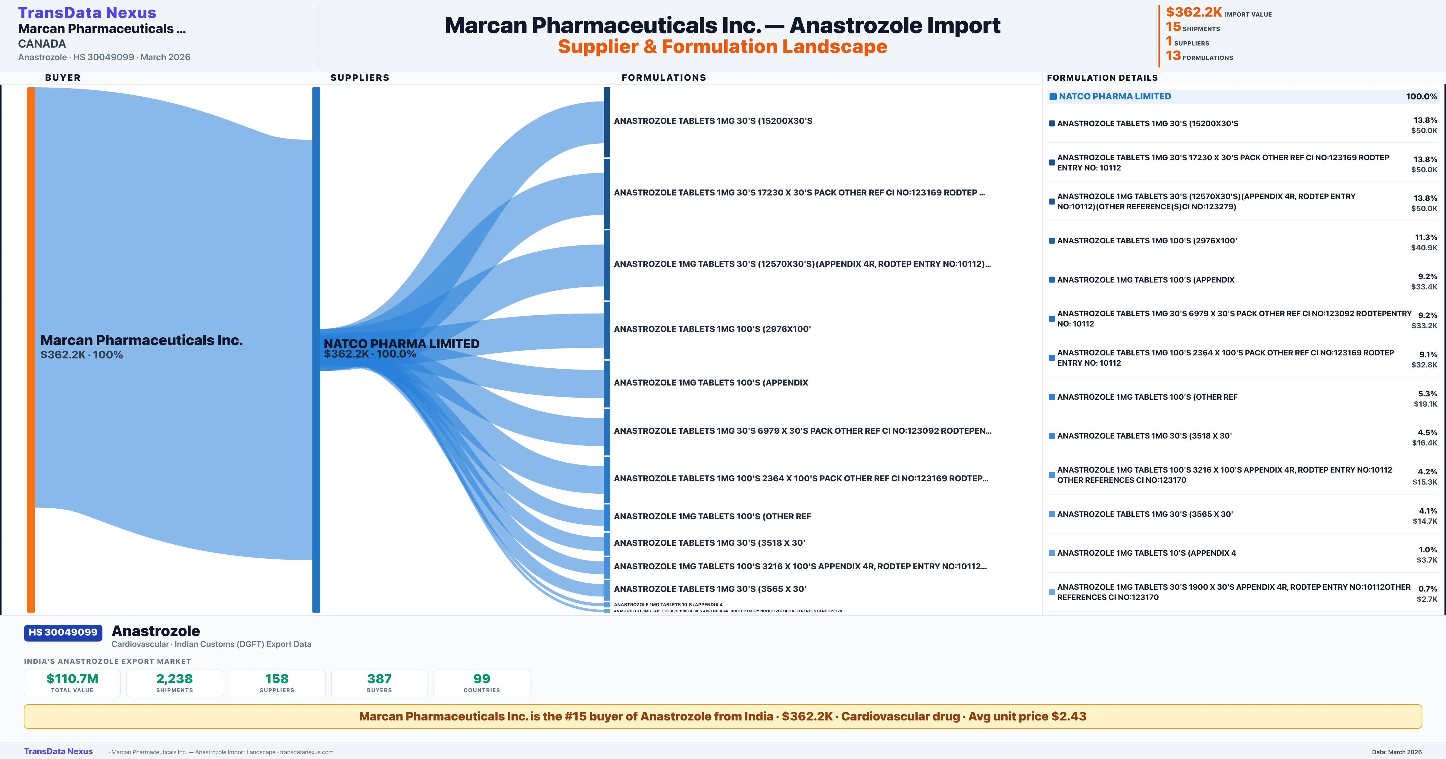 MARCAN PHARMACEUTICALS INC sources Anastrozole from 1 verified Indian supplier: NATCO PHARMA LIMITED ($362.2K, 100.0%). This is based on 15 customs records.