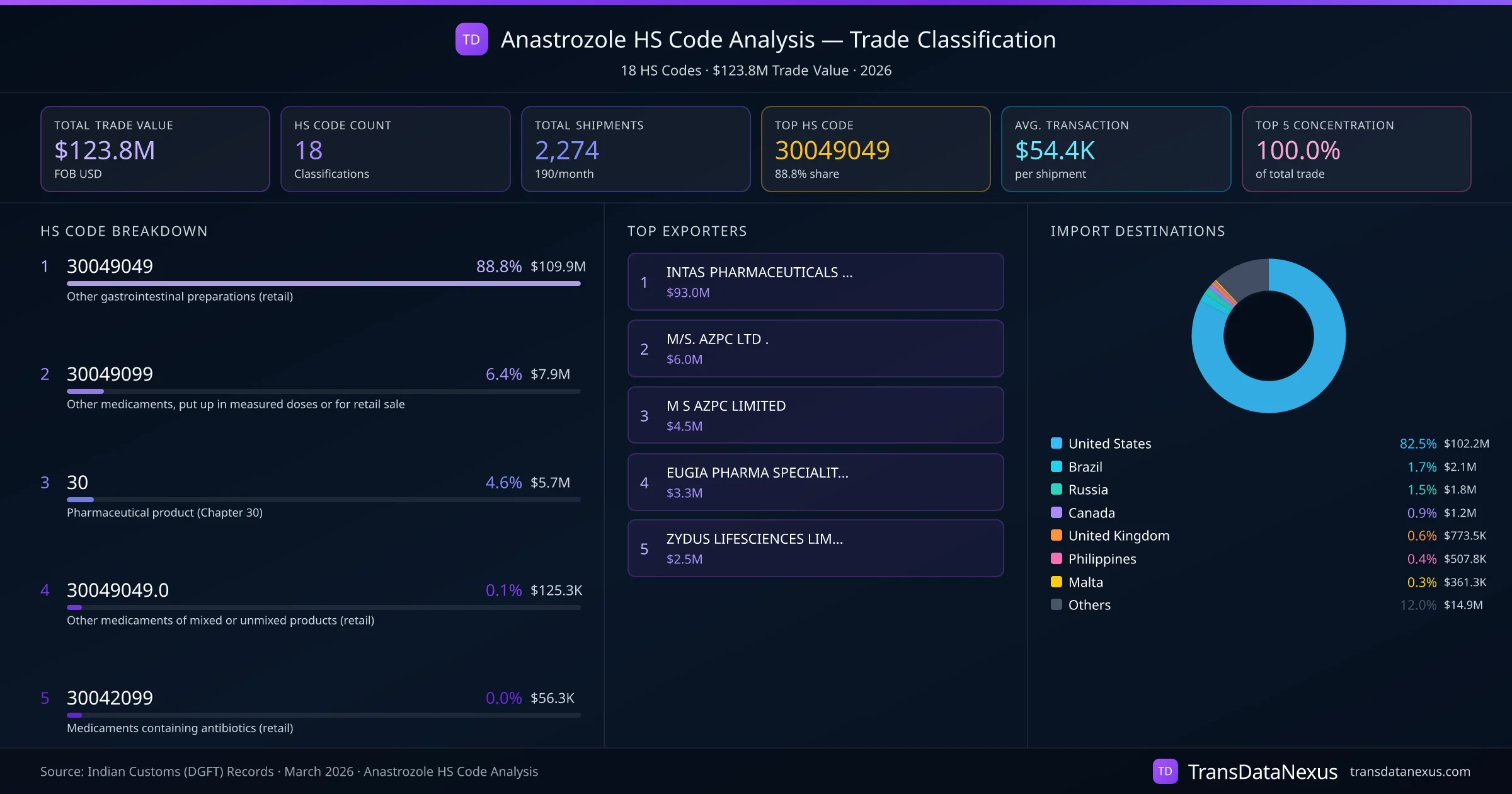 India exports Anastrozole under 18 distinct HS code classifications, representing a total trade value of $123.8M across 2,274 shipments. The dominant classification is HS 30049049 (Other gastrointestinal preparations (retail)), accounting for 88.8% of all Anastrozole trade at $109.9M. HS 30049099 (Other medicaments, put up in measured doses or for retail sale) follows at 6.4% ($7.9M). The top 5 HS codes together account for 100.0% of total Anastrozole trade from India. The average transaction value is $54432. Key importing markets include United States, Brazil, Russia. Leading exporters include INTAS PHARMACEUTICALS LIMITED and M/S. AZPC LTD . . Data sourced from Indian Customs (DGFT) shipping bill records.