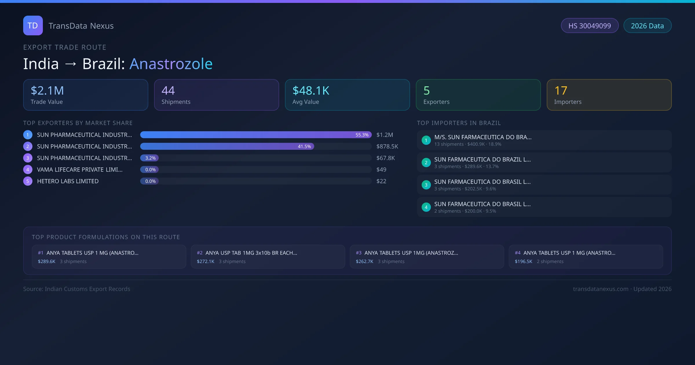 India exports Anastrozole to Brazil worth approximately $2.1M USD across 44 recorded shipments. The average value per shipment is $48.1K USD.