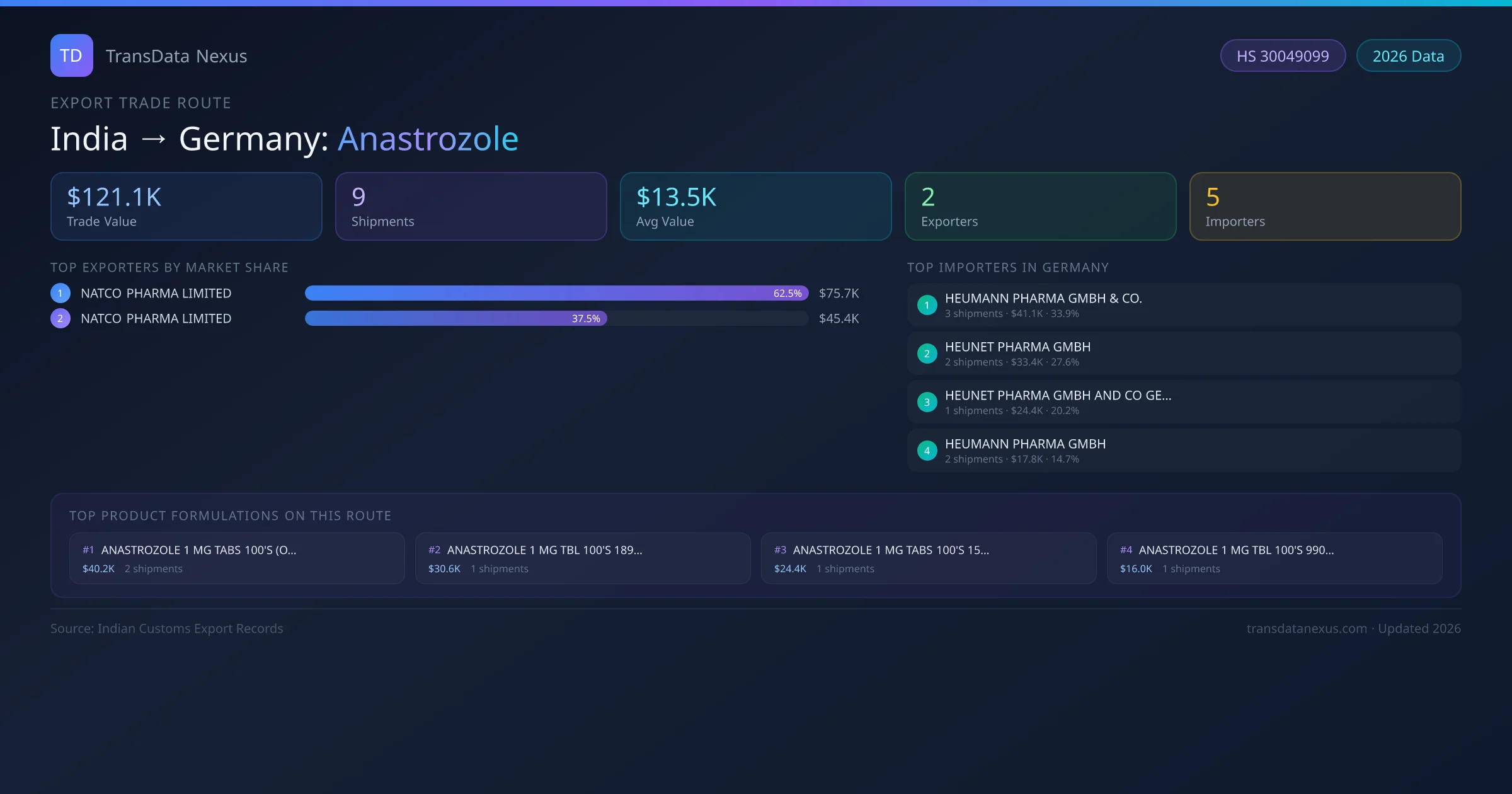 The India to Germany Anastrozole corridor is one of India's established pharmaceutical export routes, with 9 shipments documented worth a combined $121.1K USD. The route is dominated by NATCO PHARMA LIMITED, which alone accounts for roughly 63% of all export value, reflecting the consolidated nature of India's anastrozole manufacturing sector.
