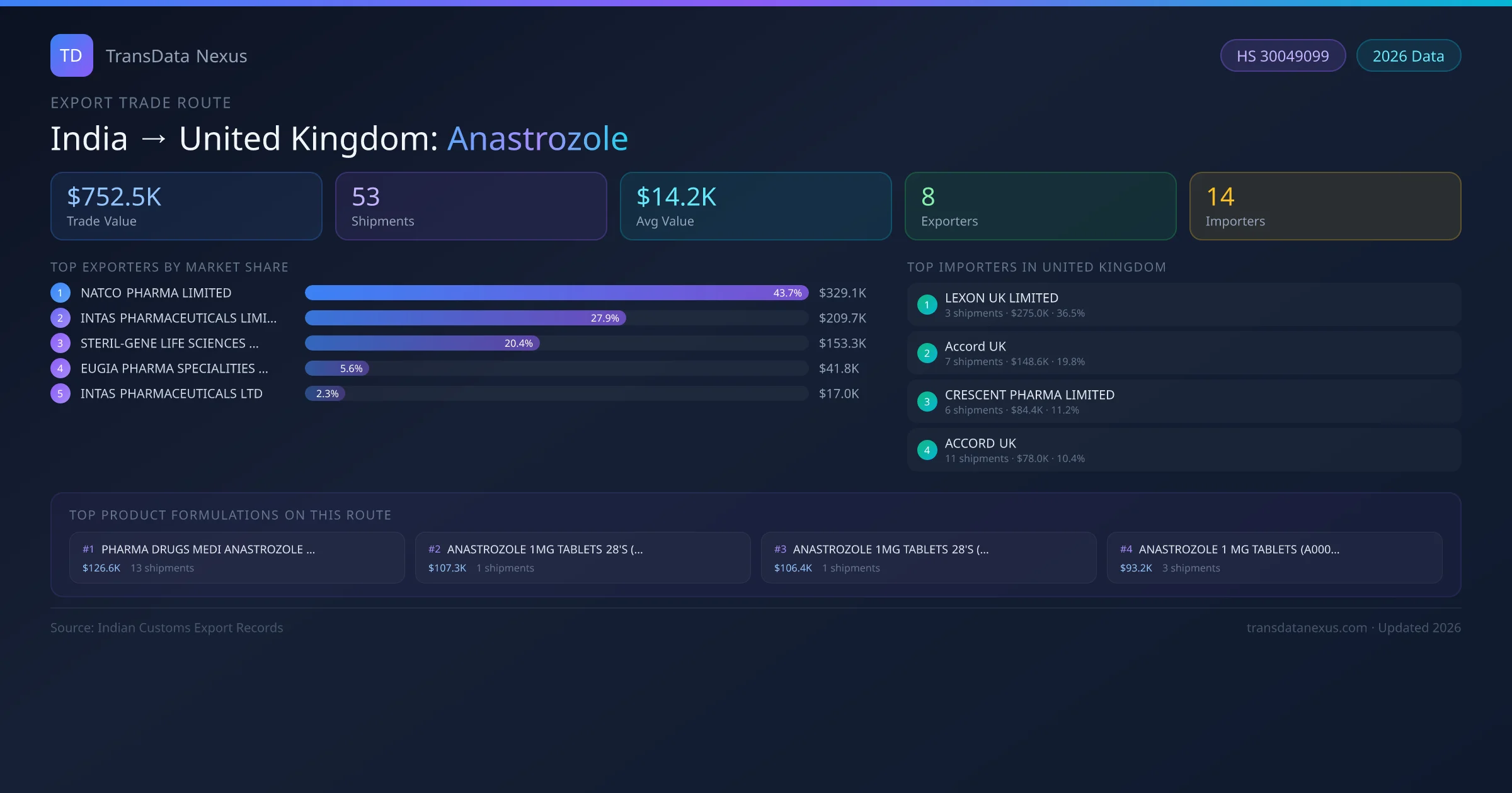 India has recorded 53 verified shipments of Anastrozole exported to United Kingdom, representing a combined trade value of $752.5K USD. This corridor is served by 8 active Indian exporters, with an average shipment value of $14.2K USD. The leading Indian exporter is NATCO PHARMA LIMITED, which accounts for 44% of total export value with 6 shipments worth $329.1K USD. On the buying side, LEXON UK LIMITED is the largest importer in United Kingdom with $275.0K USD in purchases. The top 3 suppliers — NATCO PHARMA LIMITED, INTAS PHARMACEUTICALS LIMITED, STERIL-GENE LIFE SCIENCES PRIVATE LIMITED — together control 92% of total trade value on this route. All data sourced from Indian Customs (DGFT) shipping bill records. Values reported in FOB USD.