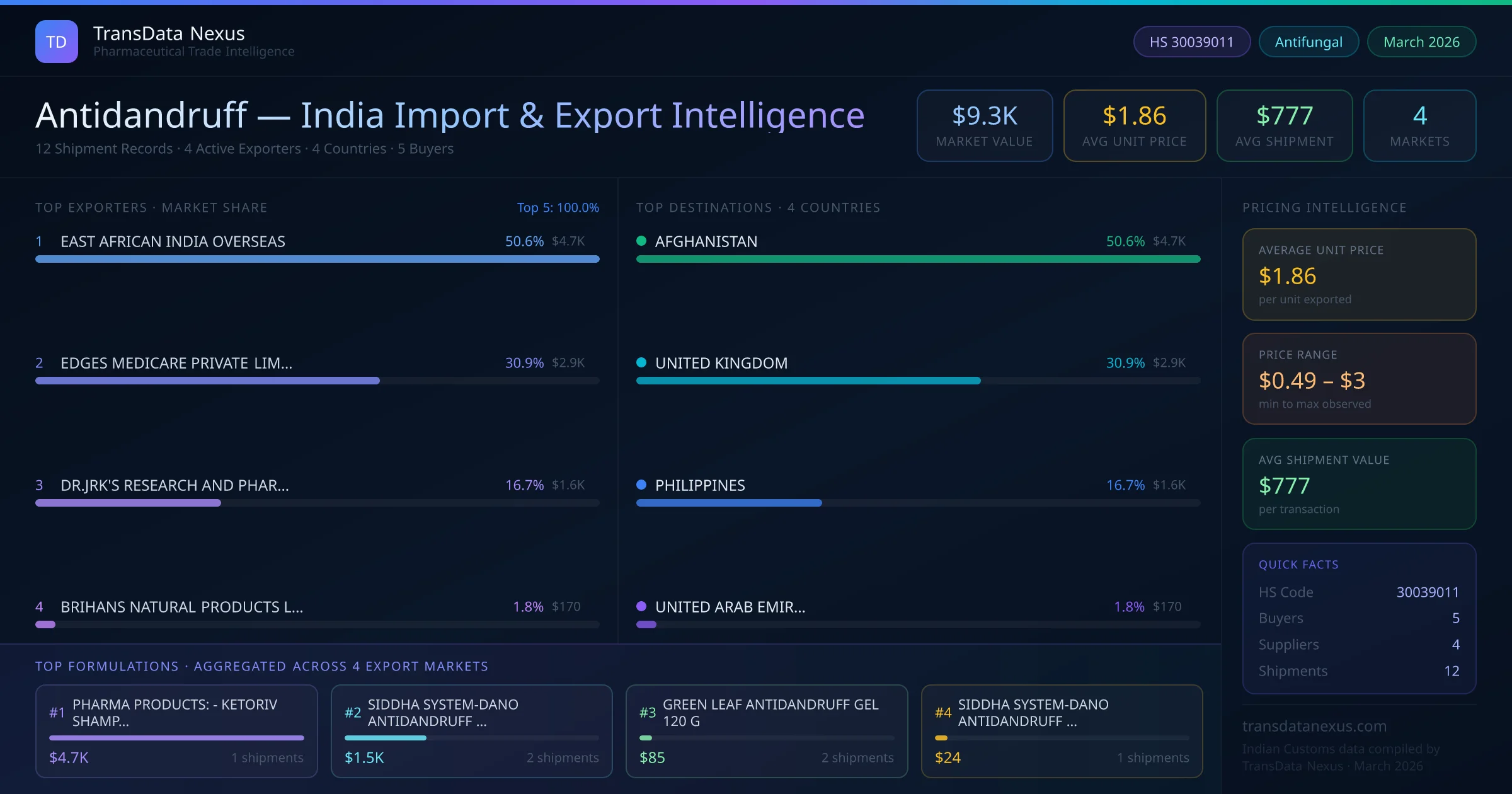 The total export value of antidandruff from India is $9.3K, recorded across 12 shipments from 4 active exporters to 4 countries. The average shipment value is $777.