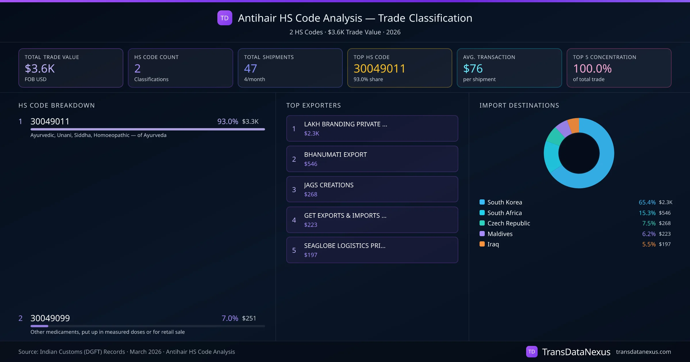India exports Antihair under 2 distinct HS code classifications, representing a total trade value of $3.6K across 47 shipments. The dominant classification is HS 30049011 (Ayurvedic, Unani, Siddha, Homoeopathic โ of Ayurveda), accounting for 93.0% of all Antihair trade at $3.3K. HS 30049099 (Other medicaments, put up in measured doses or for retail sale) follows at 7.0% ($251). The top 5 HS codes together account for 100.0% of total Antihair trade from India. The average transaction value is $76. Key importing markets include South Korea, South Africa, Czech Republic. Leading exporters include LAKH BRANDING PRIVATE LIMITED and BHANUMATI EXPORT . Data sourced from Indian Customs (DGFT) shipping bill records.