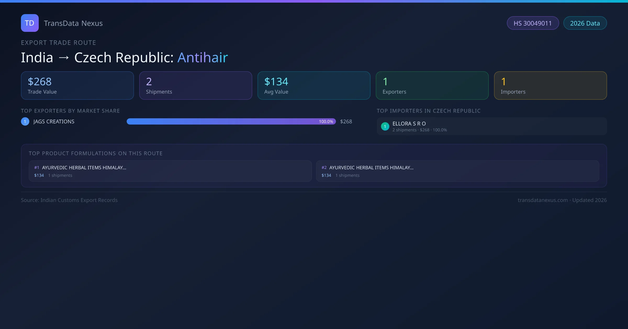 The India to Czech Republic Antihair corridor is one of India's established pharmaceutical export routes, with 2 shipments documented worth a combined $268 USD. The route is dominated by JAGS CREATIONS, which alone accounts for roughly 100% of all export value, reflecting the consolidated nature of India's antihair manufacturing sector.