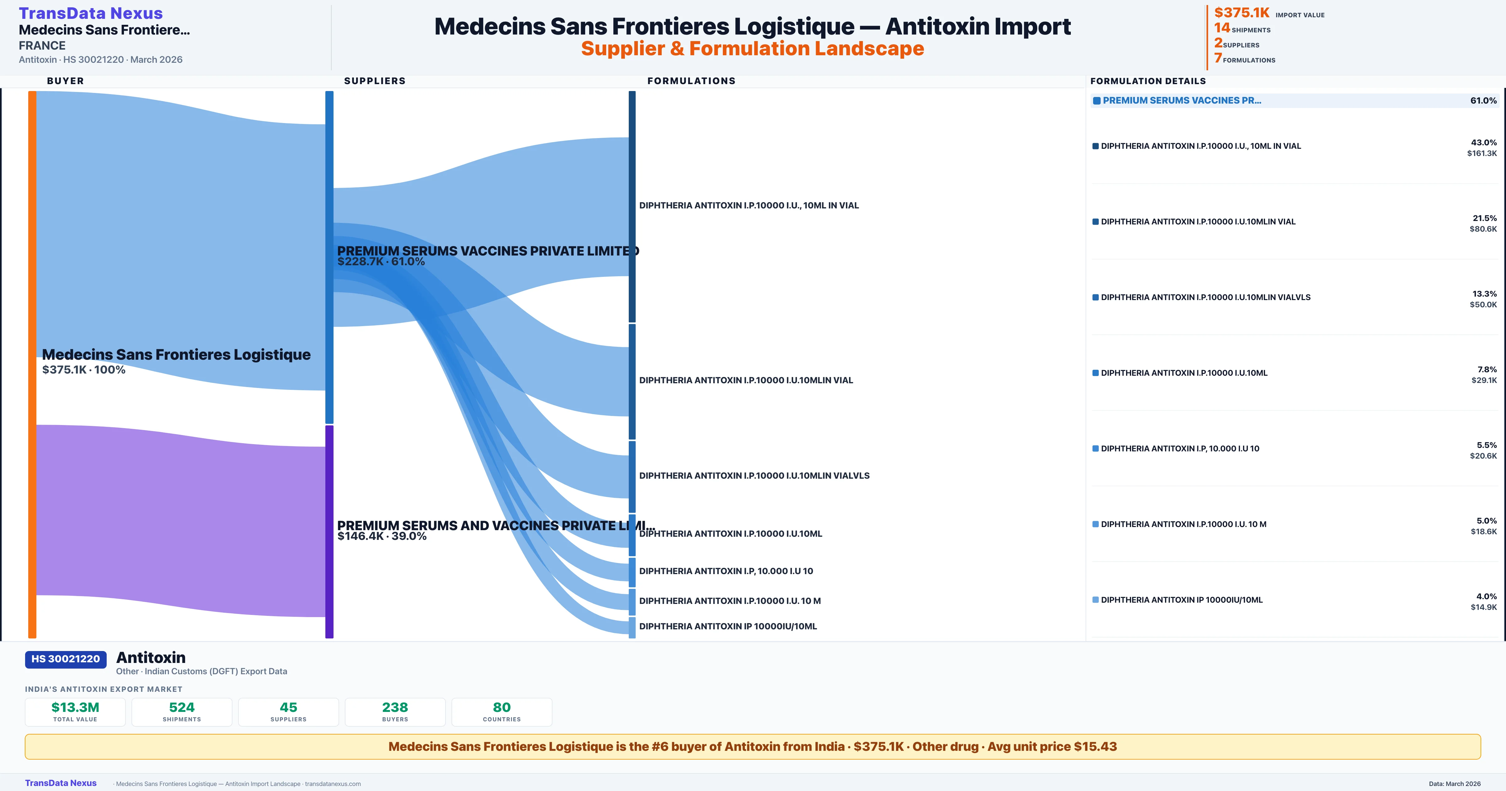 MEDECINS SANS FRONTIERES LOGISTIQUE sources Antitoxin from 2 verified Indian suppliers: PREMIUM SERUMS VACCINES PRIVATE LIMITED ($228.7K, 61.0%), PREMIUM SERUMS AND VACCINES PRIVATE LIMITED ($146.4K, 39.0%). This is based on 14 customs records.