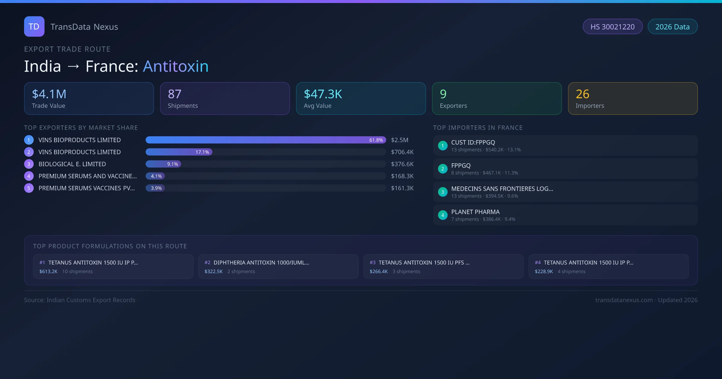 India exports Antitoxin to France worth approximately $4.1M USD across 87 recorded shipments. The average value per shipment is $47.3K USD.