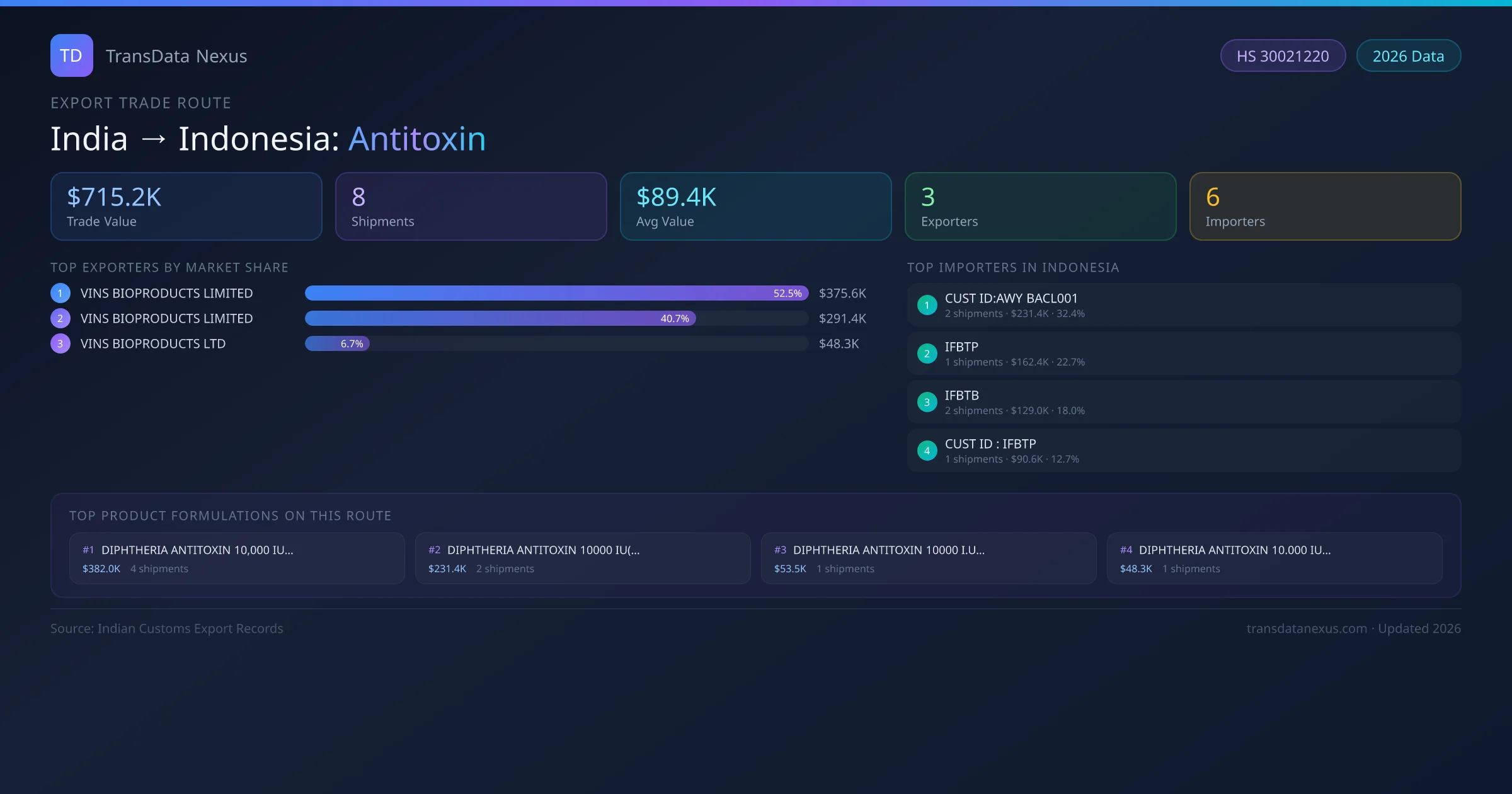The India to Indonesia Antitoxin corridor is one of India's established pharmaceutical export routes, with 8 shipments documented worth a combined $715.2K USD. The route is dominated by VINS BIOPRODUCTS LIMITED, which alone accounts for roughly 53% of all export value, reflecting the consolidated nature of India's antitoxin manufacturing sector.