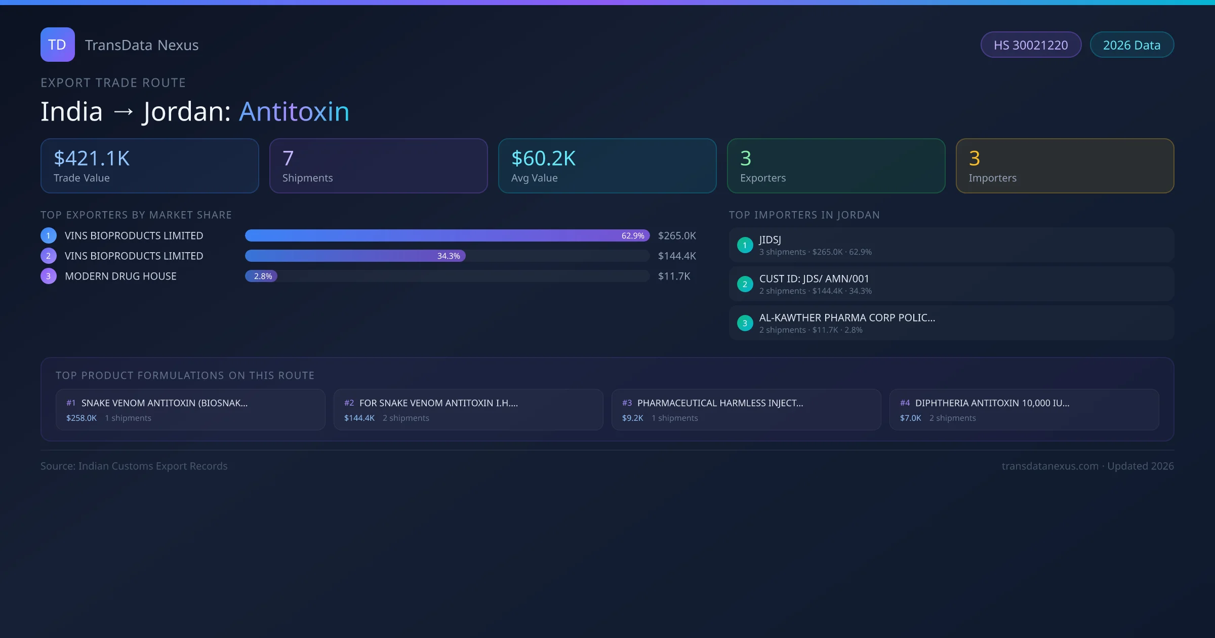 India has recorded 7 verified shipments of Antitoxin exported to Jordan, representing a combined trade value of $421.1K USD. This corridor is served by 3 active Indian exporters, with an average shipment value of $60.2K USD. The leading Indian exporter is VINS BIOPRODUCTS LIMITED , which accounts for 63% of total export value with 3 shipments worth $265.0K USD. On the buying side, JIDSJ is the largest importer in Jordan with $265.0K USD in purchases. The top 3 suppliers — VINS BIOPRODUCTS LIMITED , VINS BIOPRODUCTS LIMITED, MODERN DRUG HOUSE — together control 100% of total trade value on this route. All data sourced from Indian Customs (DGFT) shipping bill records. Values reported in FOB USD.