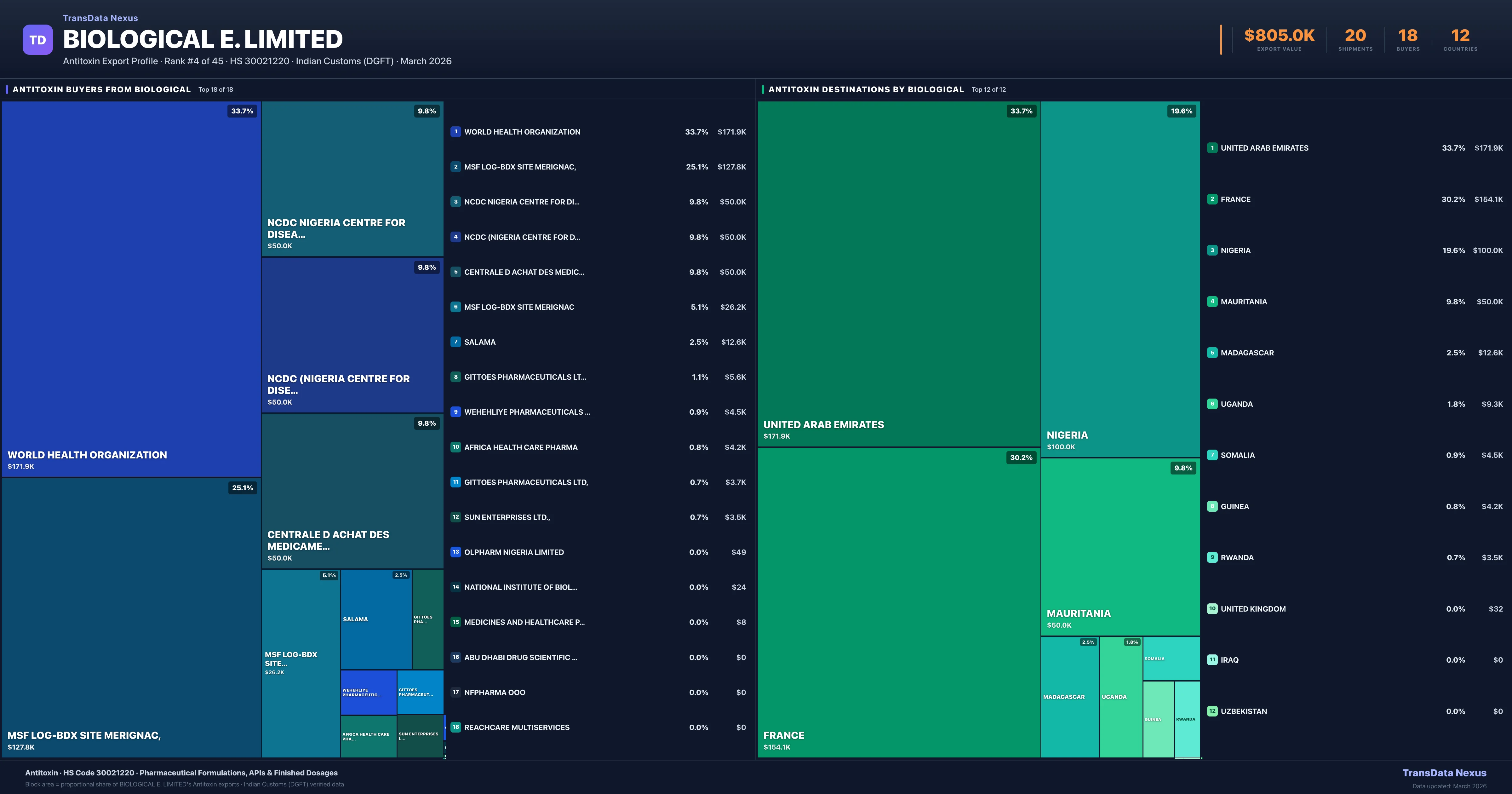 - 4.Verified Records: This page is backed by 26 individual customs records matching Biological E. Limited exporting Antitoxin, covering 21 formulations to 12 countries via 18 buyers.