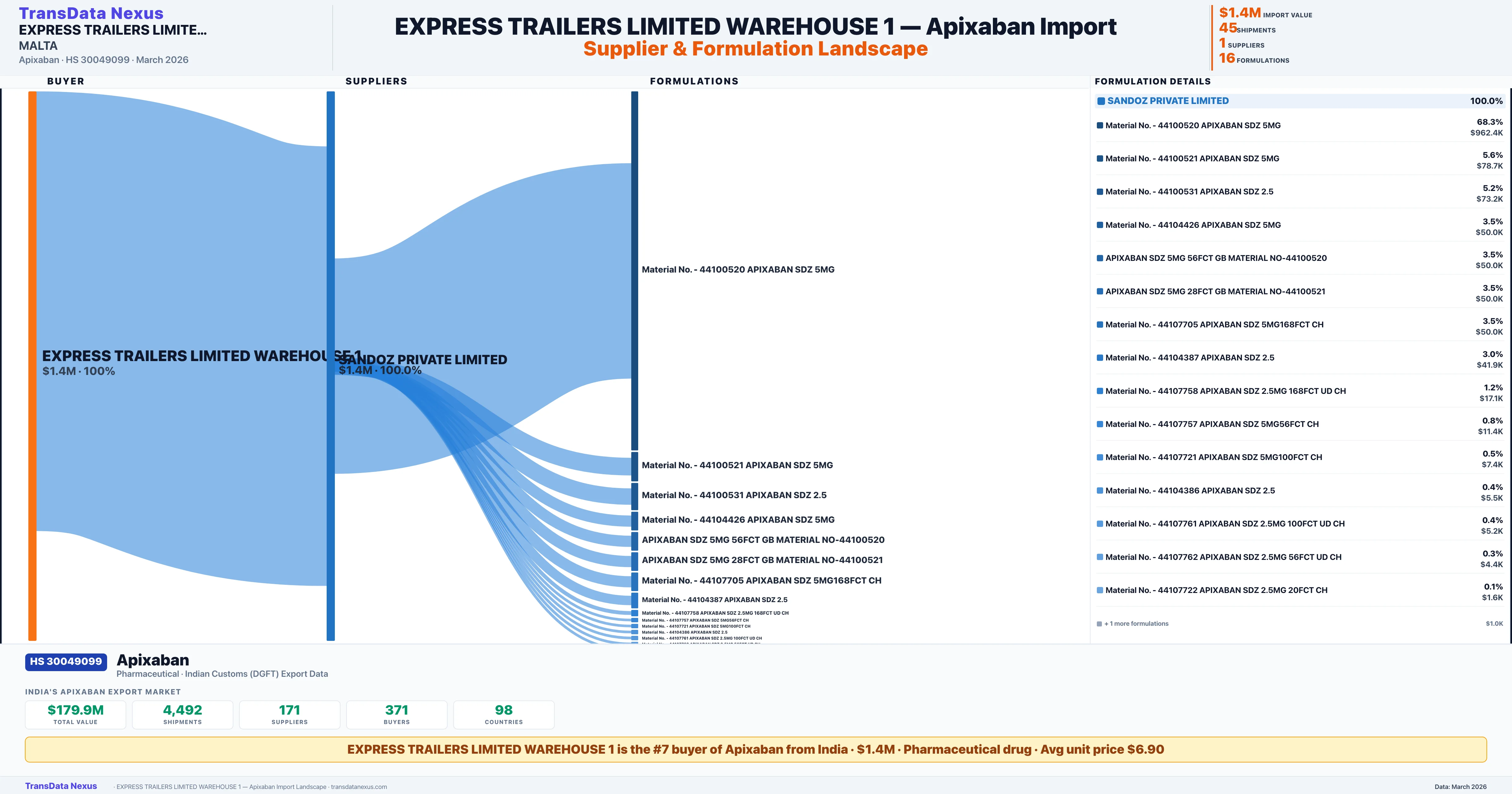 EXPRESS TRAILERS LIMITED WAREHOUSE 1 is the #18 importer of Apixaban from India with $1.4M in import value and 45 verified shipments. EXPRESS TRAILERS LIMITED WAREHOUSE 1 holds a 0.7% market share in Apixaban imports based in MALTA. The company sources from 1 verified supplier across 16 formulations shipped to 1 country.