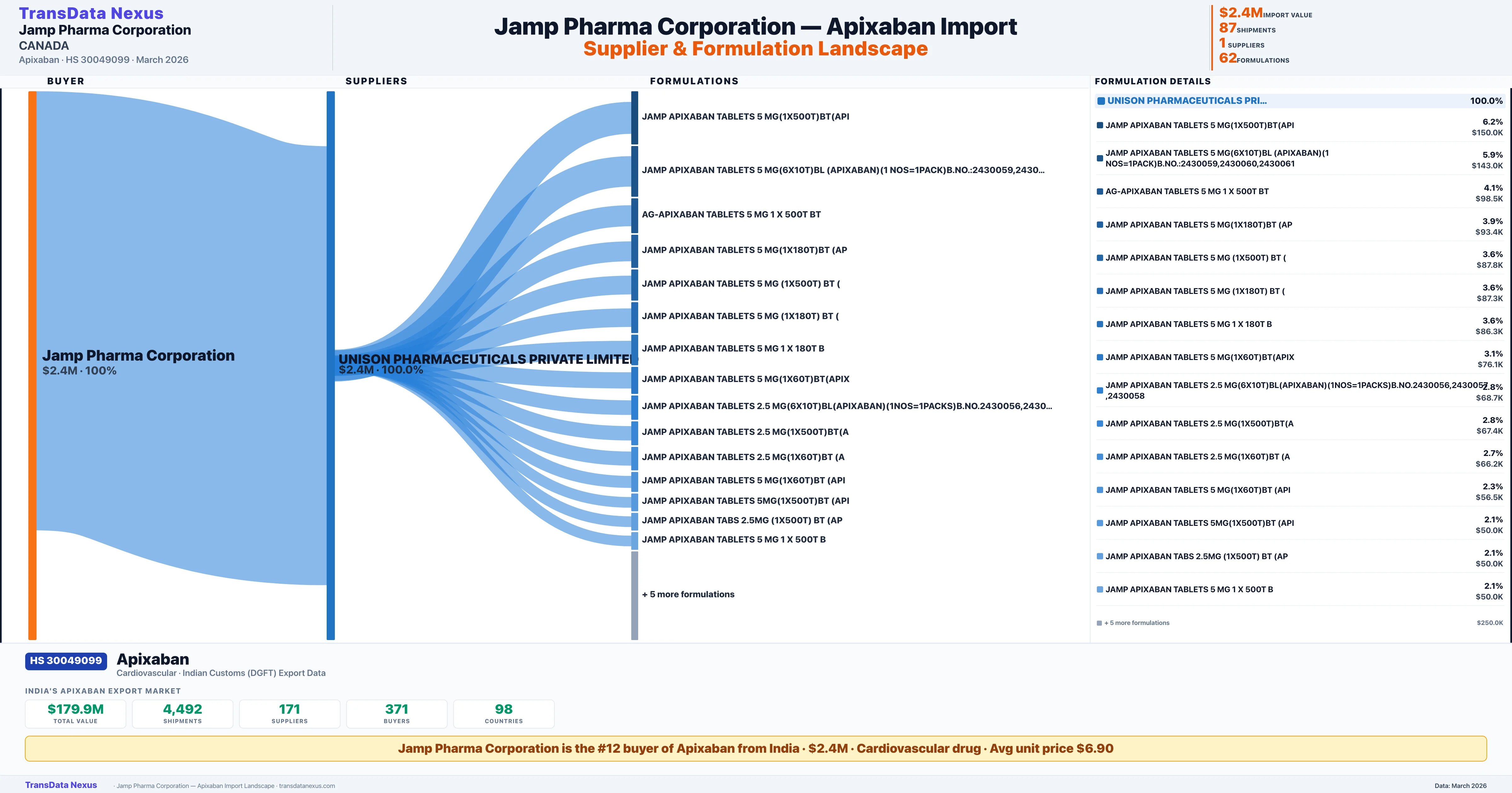 JAMP PHARMA CORPORATION sources Apixaban from 1 verified Indian supplier: UNISON PHARMACEUTICALS PRIVATE LIMITED ($2.4M, 100.0%). This is based on 87 customs records.