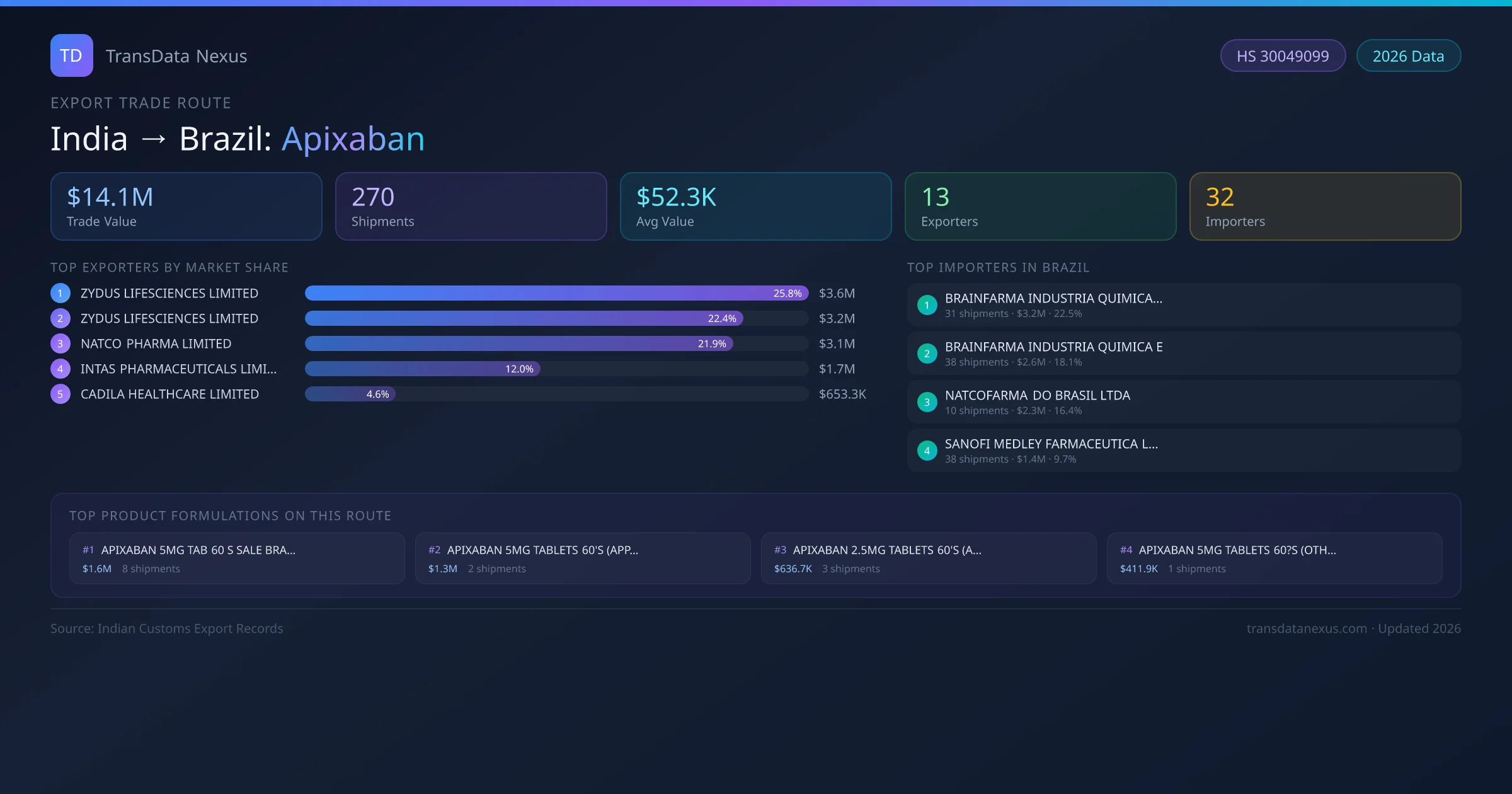 India exports Apixaban to Brazil worth approximately $14.1M USD across 270 recorded shipments. The average value per shipment is $52.3K USD.