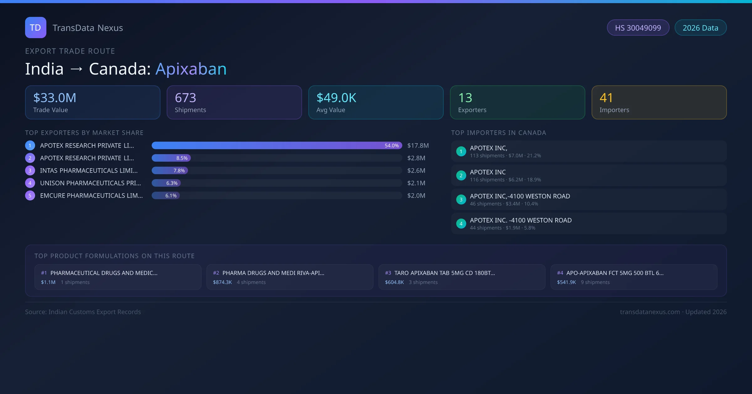 - 1.Route Identification: India to Canada export trade corridor identified from Indian Customs (DGFT) records for Apixaban.