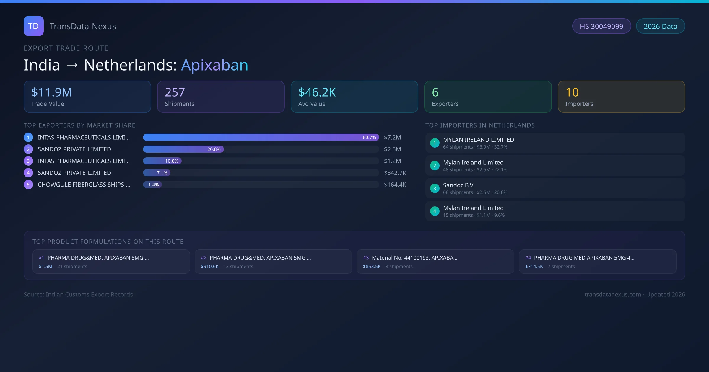 India has recorded 257 verified shipments of Apixaban exported to Netherlands, representing a combined trade value of $11.9M USD. This corridor is served by 6 active Indian exporters, with an average shipment value of $46.2K USD. The leading Indian exporter is INTAS PHARMACEUTICALS LIMITED, which accounts for 61% of total export value with 138 shipments worth $7.2M USD. On the buying side, MYLAN IRELAND LIMITED is the largest importer in Netherlands with $3.9M USD in purchases. The top 3 suppliers — INTAS PHARMACEUTICALS LIMITED, SANDOZ PRIVATE LIMITED , INTAS PHARMACEUTICALS LIMITED — together control 92% of total trade value on this route. All data sourced from Indian Customs (DGFT) shipping bill records. Values reported in FOB USD.