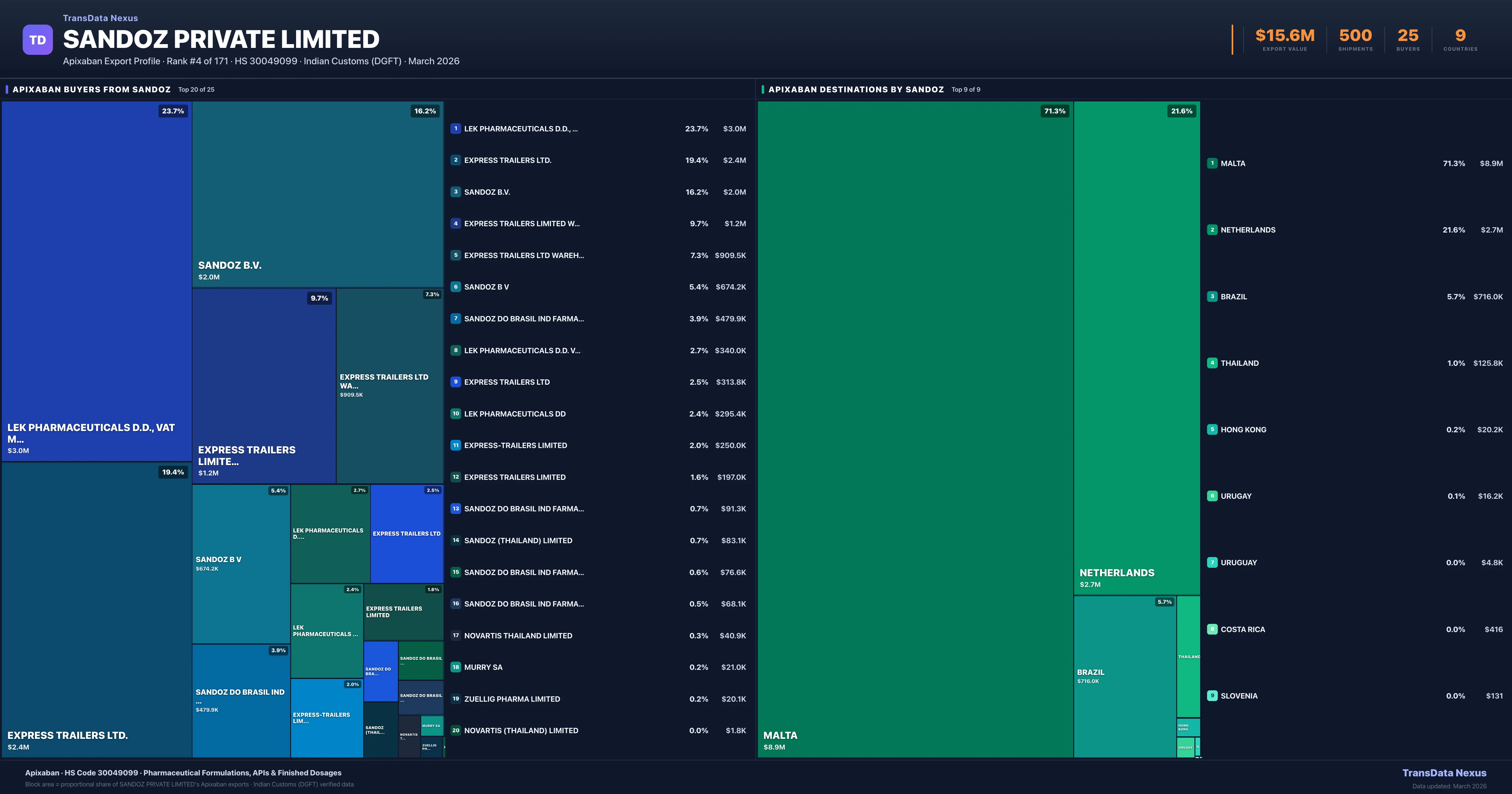 Sandoz Private Limited β Apixaban Export Profile: Buyers & Destinations
