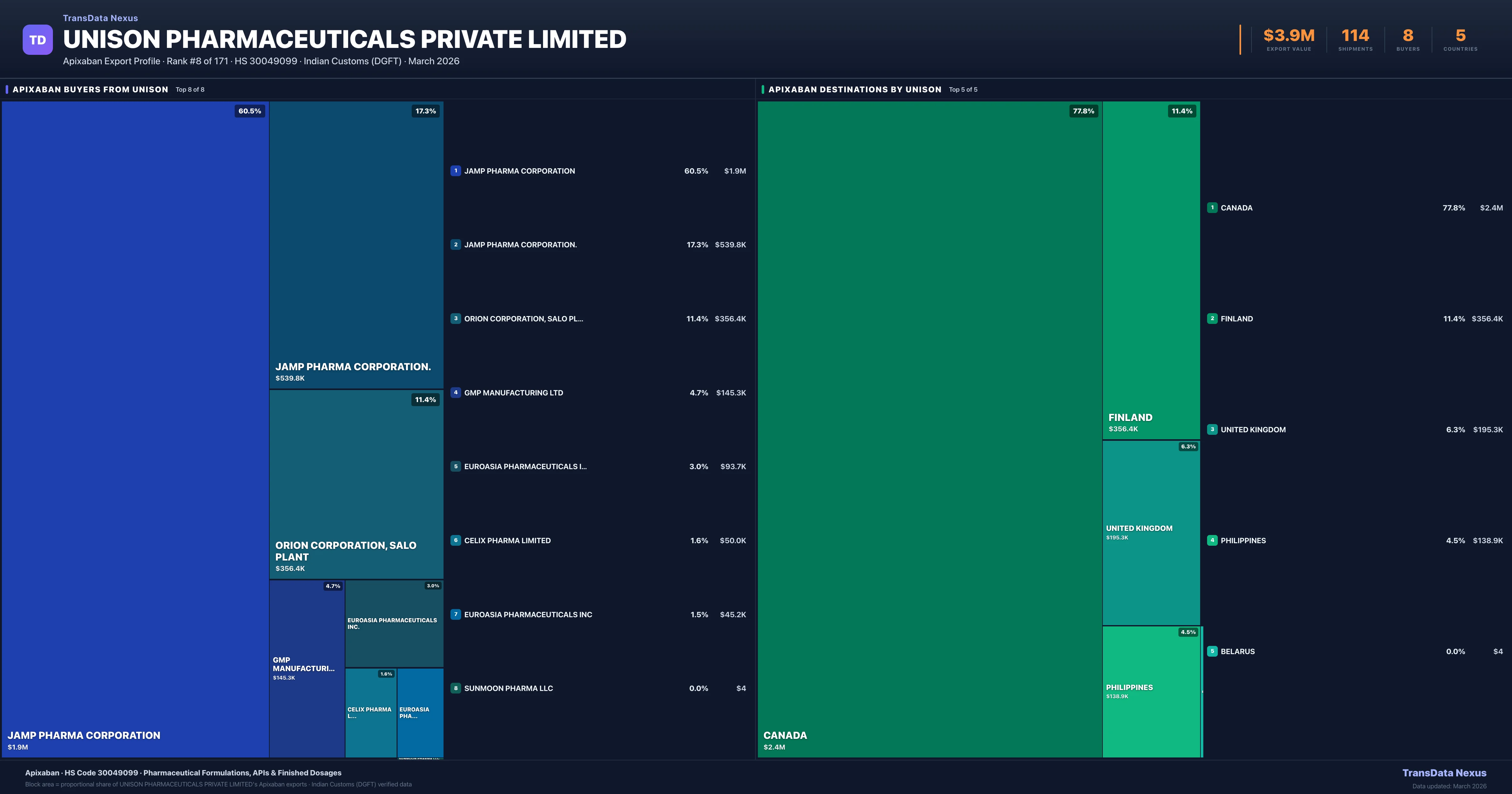 Unison Pharmaceuticals Private Limited — Apixaban Export Profile: Buyers & Destinations