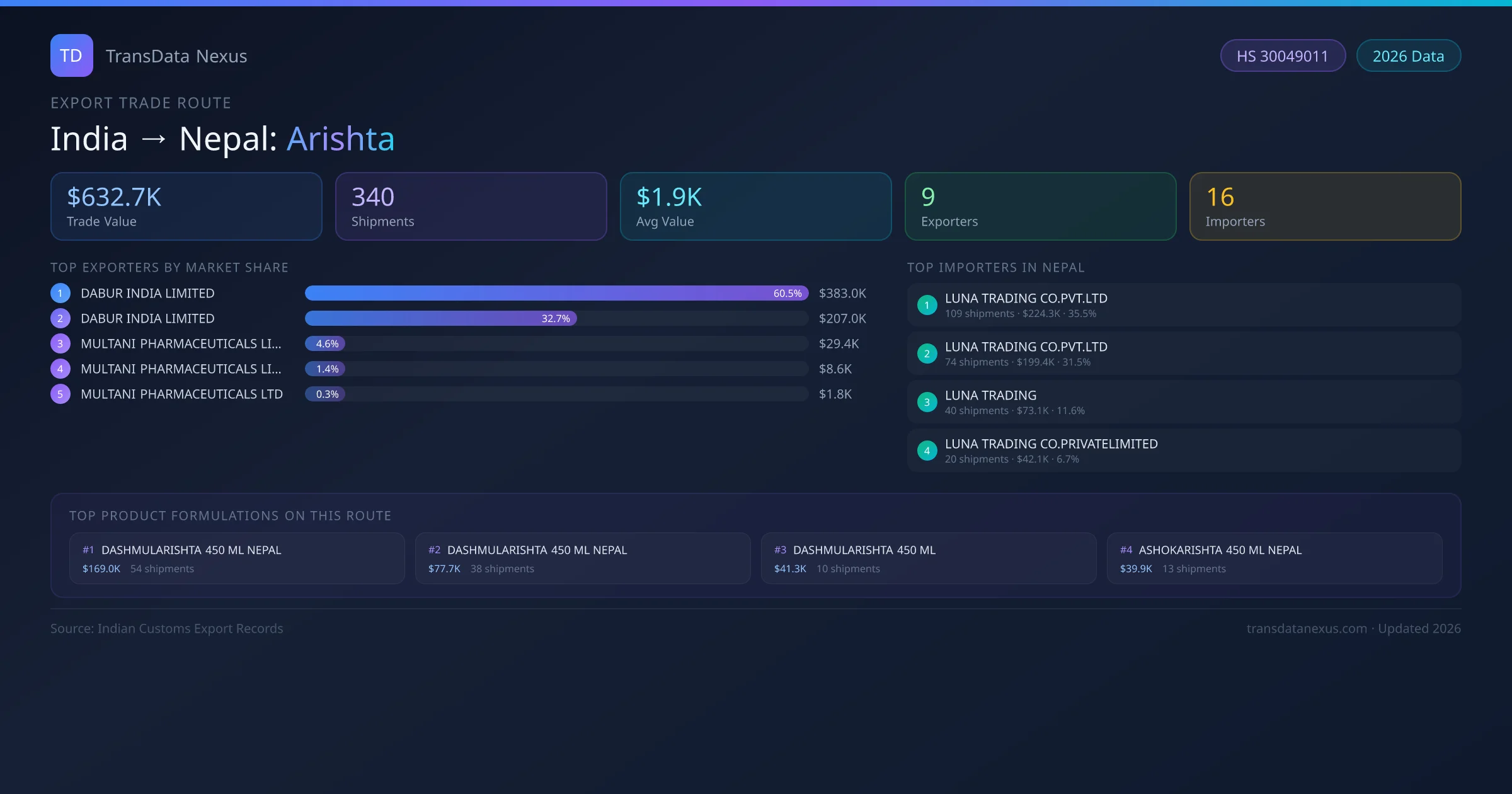 India has recorded 340 verified shipments of Arishta exported to Nepal, representing a combined trade value of $632.7K USD. This corridor is served by 9 active Indian exporters, with an average shipment value of $1.9K USD. The leading Indian exporter is DABUR INDIA LIMITED, which accounts for 61% of total export value with 190 shipments worth $383.0K USD. On the buying side, LUNA TRADING CO.PVT.LTD is the largest importer in Nepal with $224.3K USD in purchases. The top 3 suppliers โ DABUR INDIA LIMITED, DABUR INDIA LIMITED , MULTANI PHARMACEUTICALS LIMITED โ together control 98% of total trade value on this route. All data sourced from Indian Customs (DGFT) shipping bill records. Values reported in FOB USD.