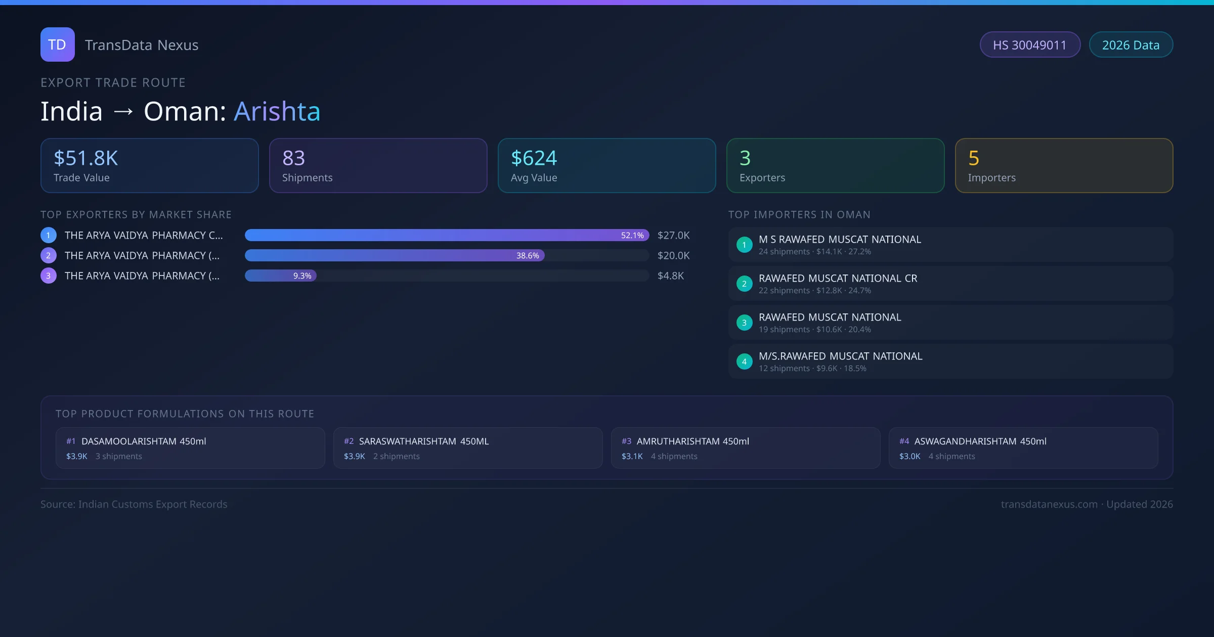 - 1.Route Identification: India to Oman export trade corridor identified from Indian Customs (DGFT) records for Arishta.