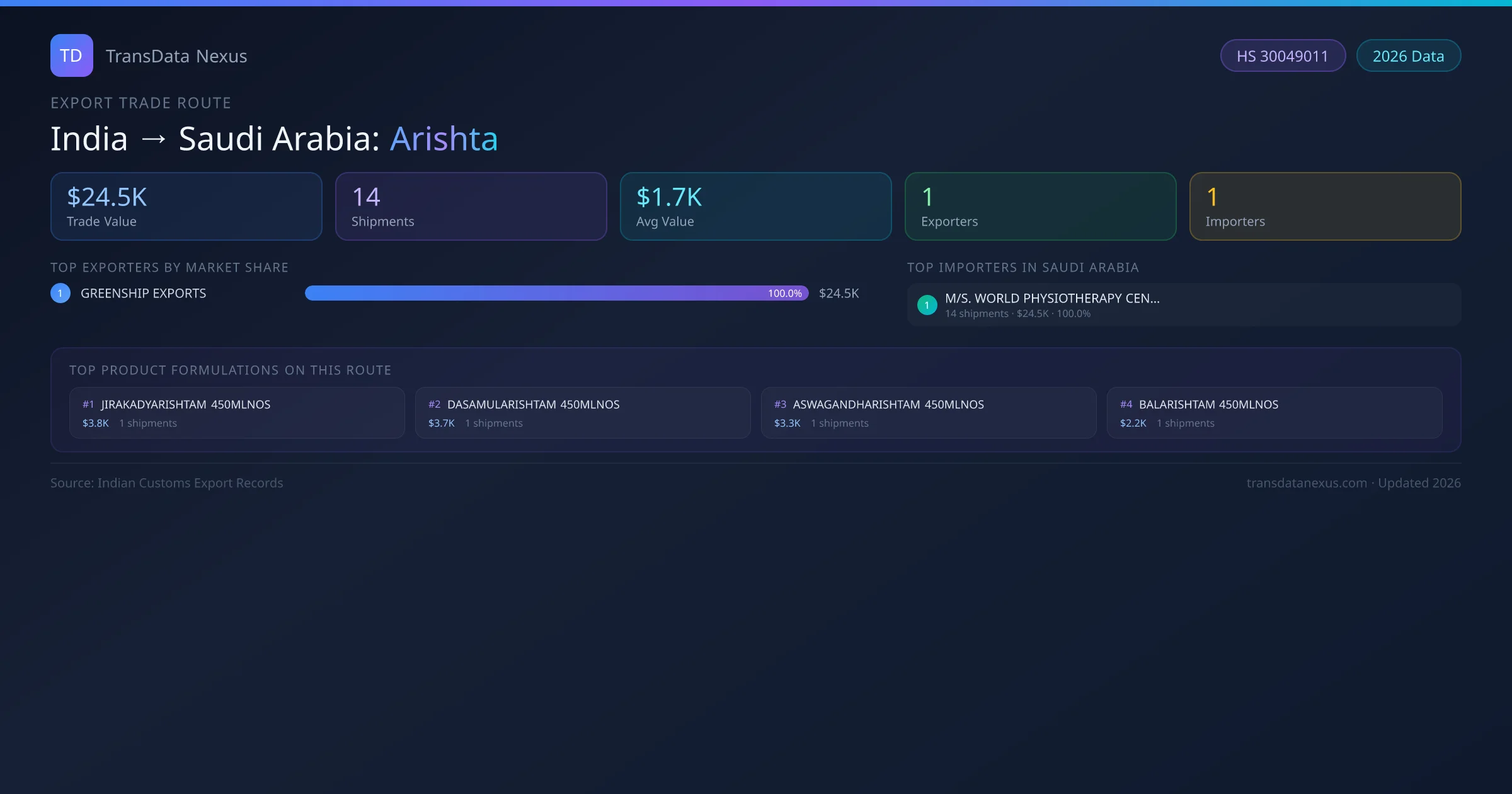 The India to Saudi Arabia Arishta corridor is one of India's established pharmaceutical export routes, with 14 shipments documented worth a combined $24.5K USD. The route is dominated by GREENSHIP EXPORTS, which alone accounts for roughly 100% of all export value, reflecting the consolidated nature of India's arishta manufacturing sector.