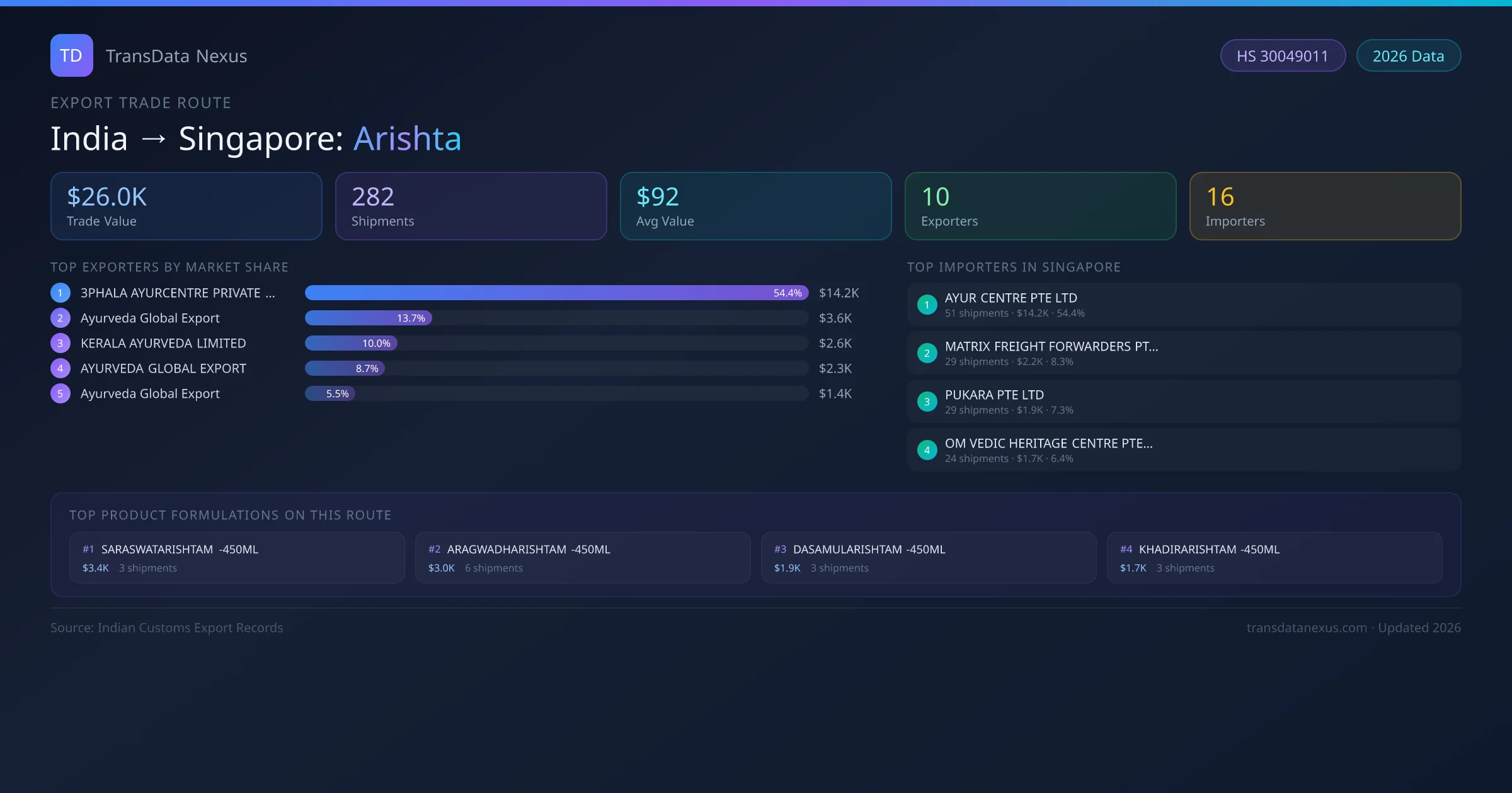 India exports Arishta to Singapore worth approximately $26.0K USD across 282 recorded shipments. The average value per shipment is $92 USD.