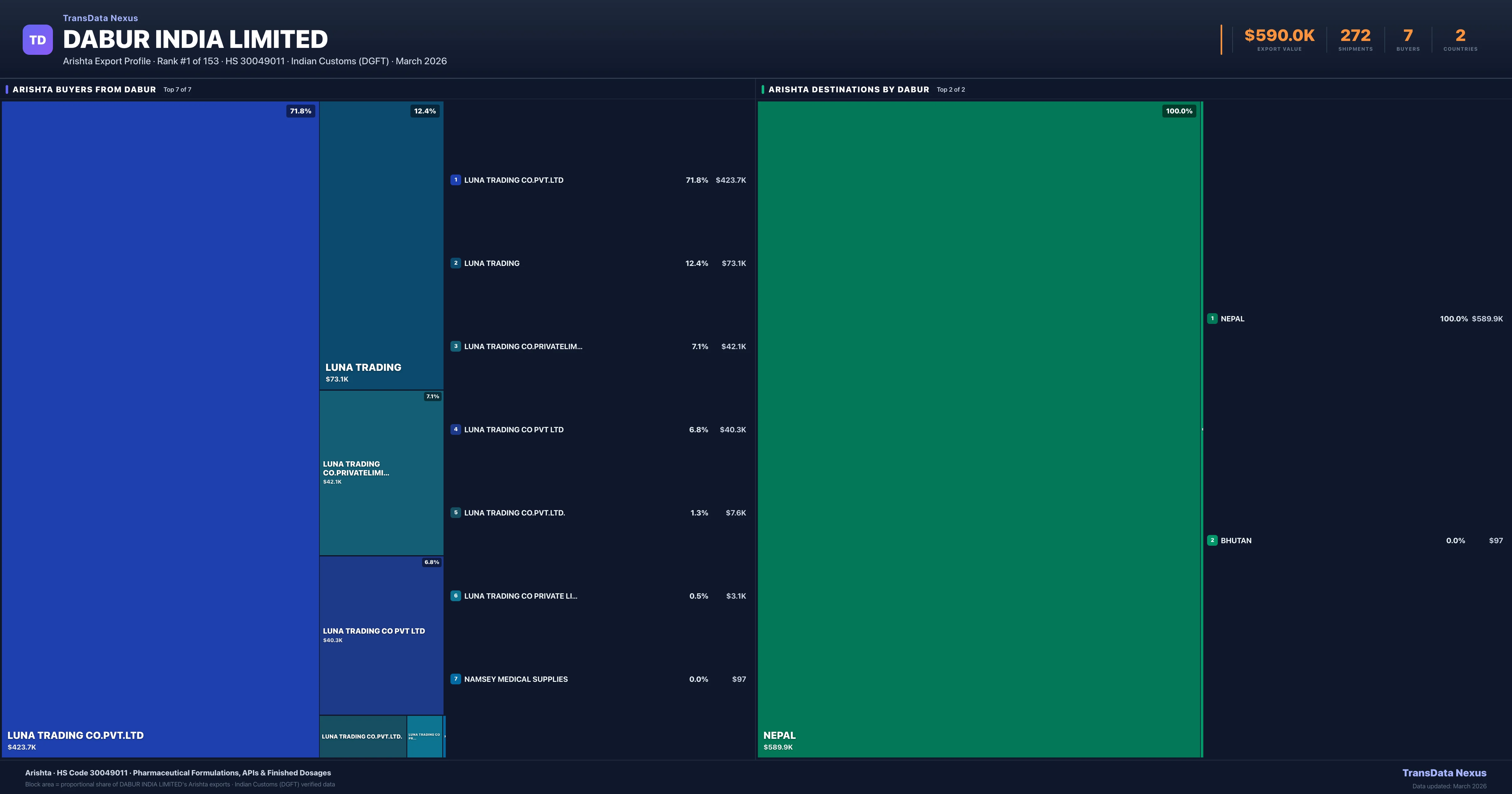 Dabur India Limited supplies Arishta to 7 buyers globally. The largest buyer is LUNA TRADING CO.PVT.LTD (NEPAL), followed by LUNA TRADING (NEPAL) and LUNA TRADING CO.PRIVATELIMITED (NEPAL). These buyers represent pharmaceutical distributors, hospital groups, and government procurement agencies in their respective markets.