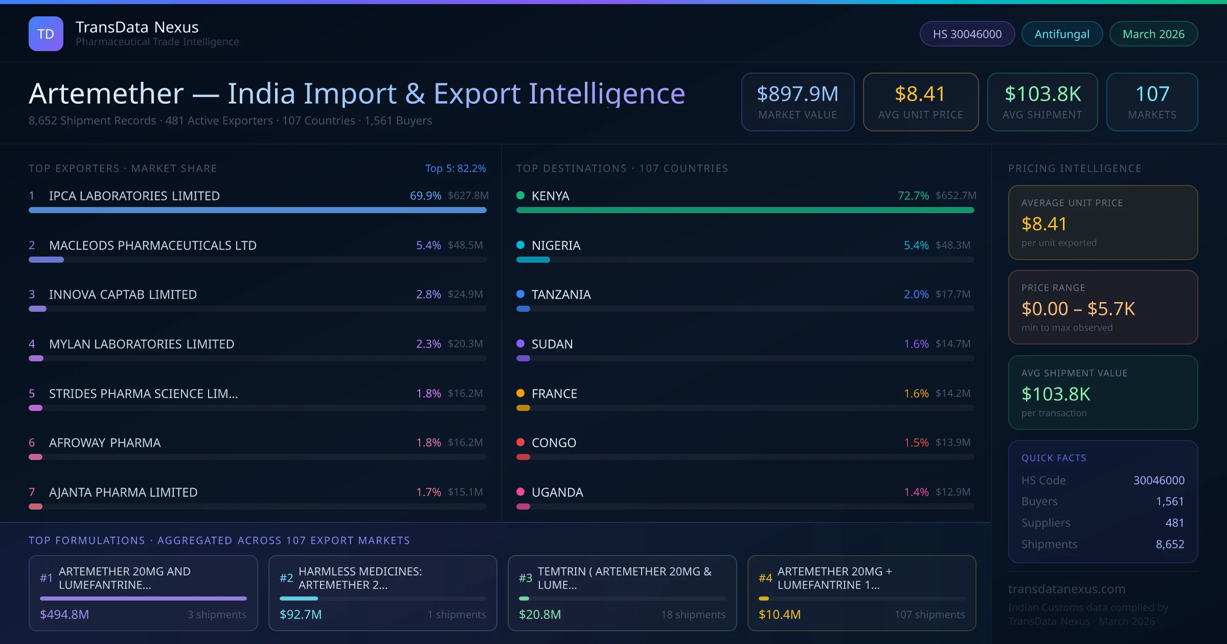 Between 2022 and 2026, India exported $897.9M worth of artemether across 8,652 verified shipments to 107 countries — covering 55% of world markets in the Antimalarial & Antiparasitic segment. The largest destination is KENYA (72.7%). IPCA LABORATORIES LIMITED leads with a 69.9% share. All figures are drawn from Indian Customs (DGFT) shipping bill records spanning four years of trade activity.