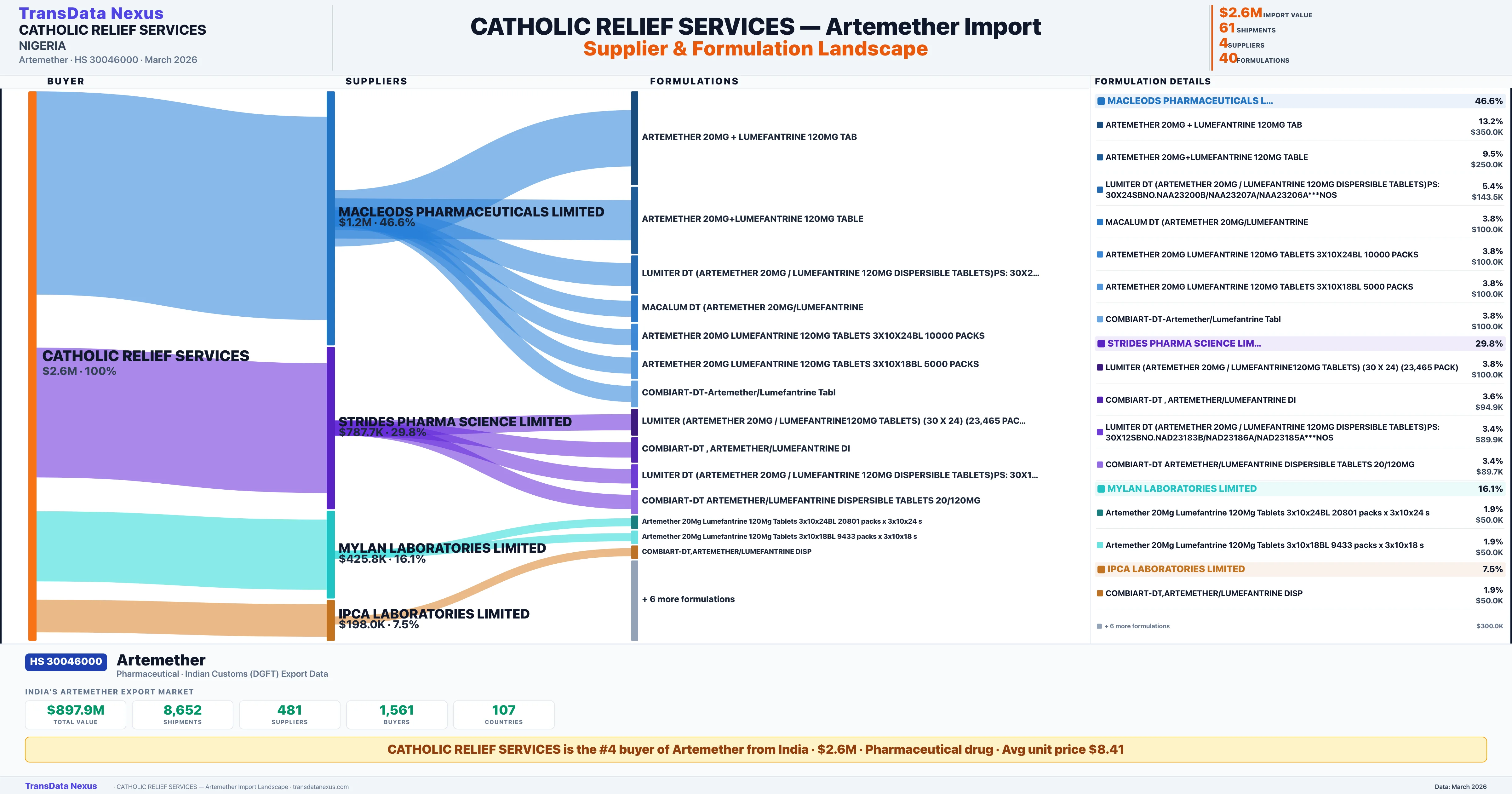Access order-level details, pricing data, supplier connections, and competitive analysis for CATHOLIC RELIEF SERVICES's Artemether imports. TransData Nexus provides verified Indian Customs (DGFT) data trusted by pharmaceutical trade professionals worldwide.