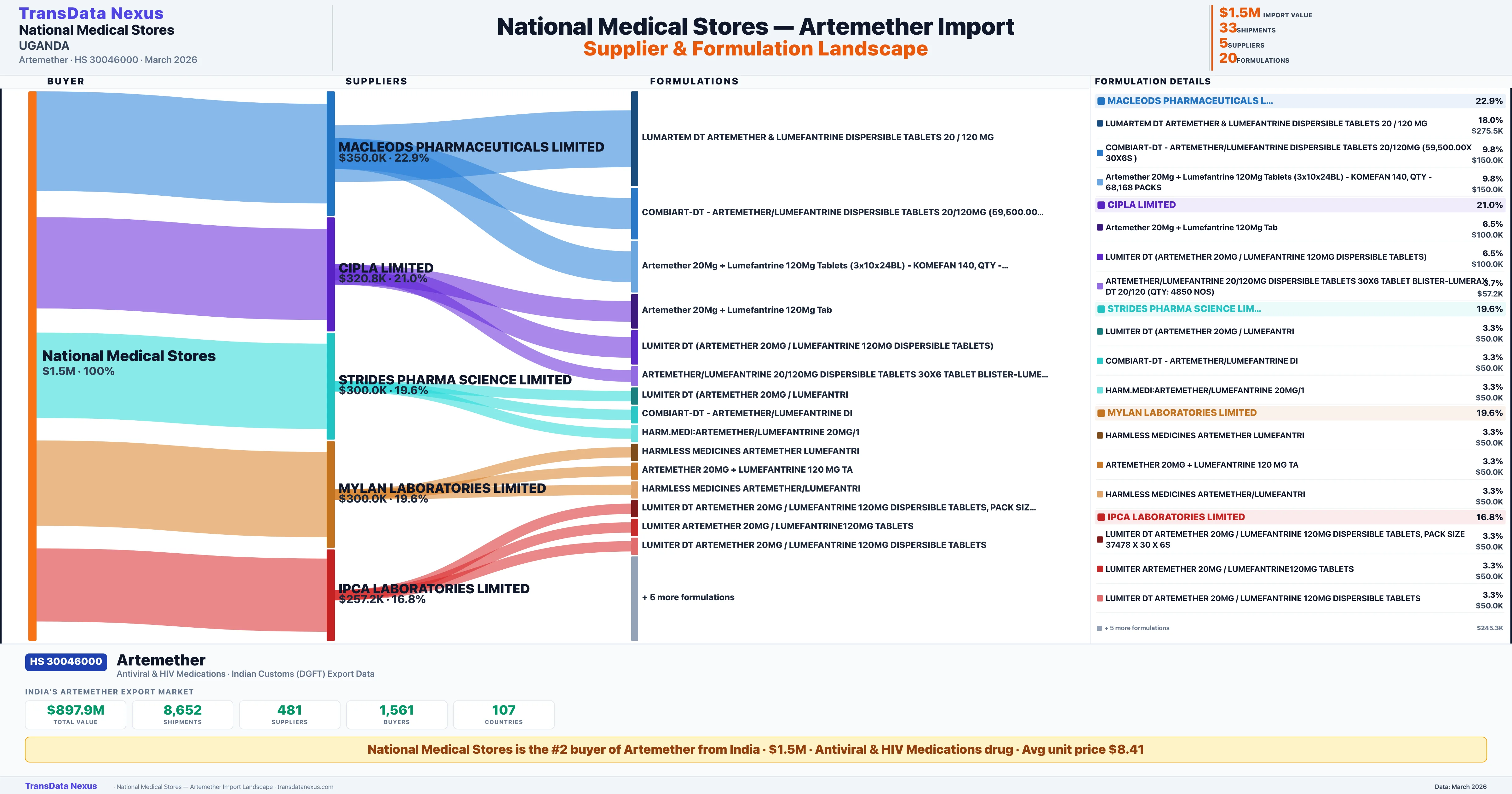 NATIONAL MEDICAL STORES sources Artemether from 5 verified Indian suppliers: MACLEODS PHARMACEUTICALS LIMITED ($350.0K, 22.9%), CIPLA LIMITED ($320.8K, 21.0%), STRIDES PHARMA SCIENCE LIMITED ($300.0K, 19.6%), MYLAN LABORATORIES LIMITED ($300.0K, 19.6%), IPCA LABORATORIES LIMITED ($257.2K, 16.8%). This is based on 33 customs records.