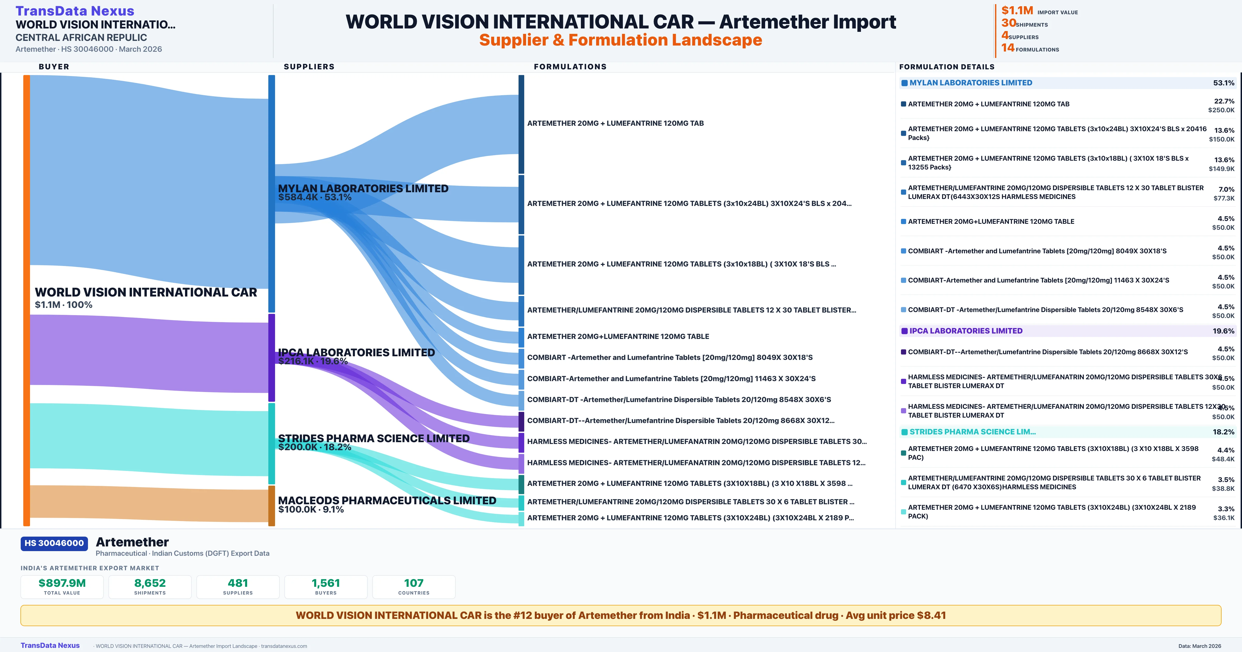 WORLD VISION INTERNATIONAL CAR sources Artemether from 4 verified Indian suppliers: MYLAN LABORATORIES LIMITED ($584.4K, 53.1%), IPCA LABORATORIES LIMITED ($216.1K, 19.6%), STRIDES PHARMA SCIENCE LIMITED ($200.0K, 18.2%), MACLEODS PHARMACEUTICALS LIMITED ($100.0K, 9.1%). This is based on 30 customs records.