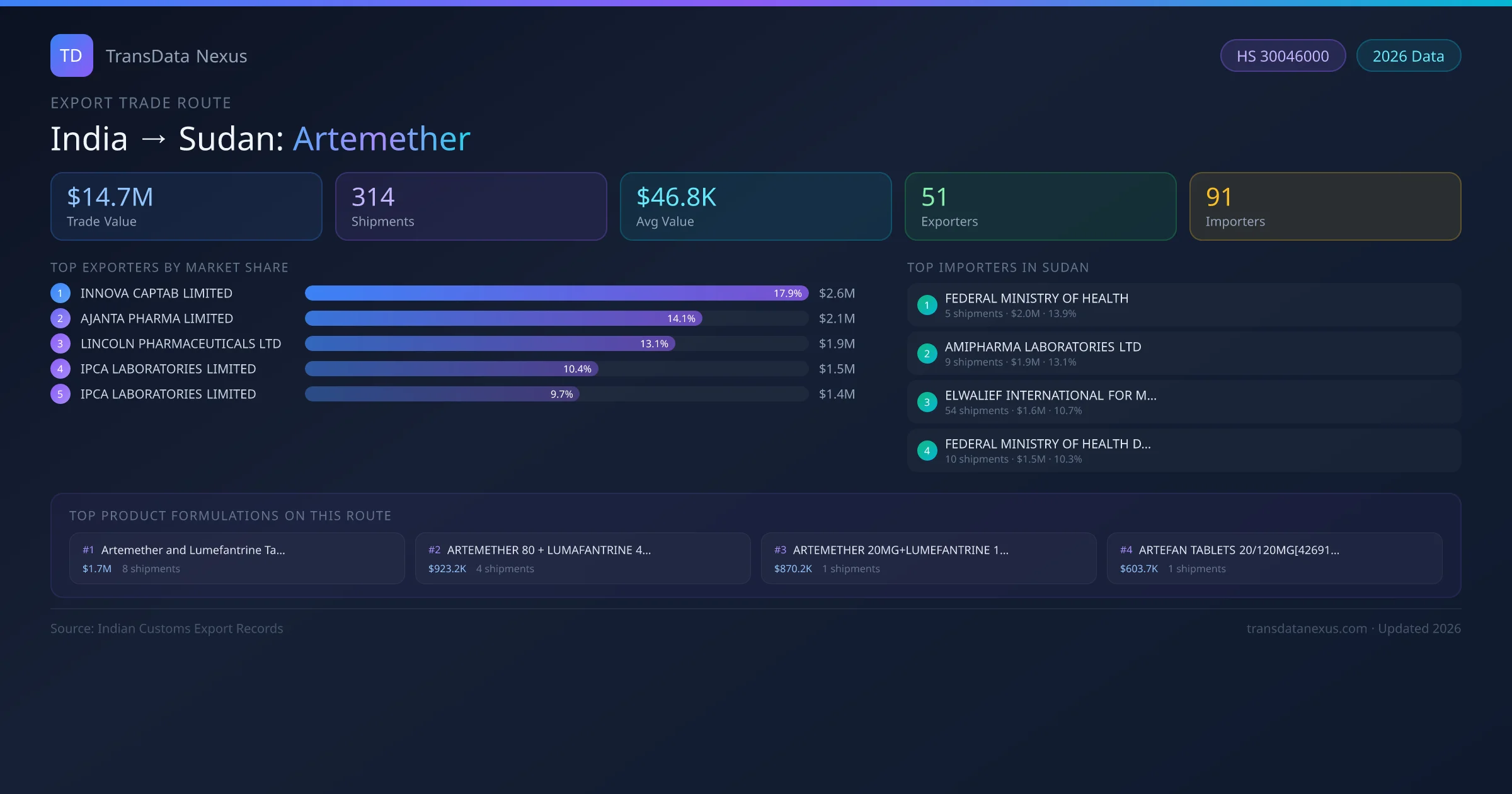 India exports Artemether to Sudan worth approximately $14.7M USD across 314 recorded shipments. The average value per shipment is $46.8K USD.