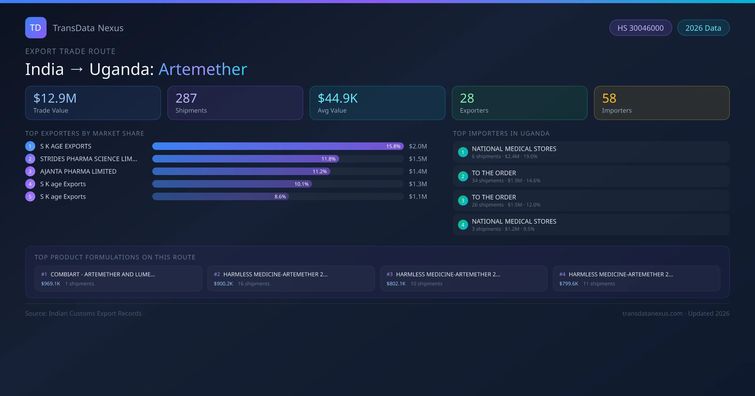 The India to Uganda Artemether corridor is one of India's established pharmaceutical export routes, with 287 shipments documented worth a combined $12.9M USD. The route is dominated by S K AGE EXPORTS, which alone accounts for roughly 16% of all export value, reflecting the consolidated nature of India's artemether manufacturing sector.