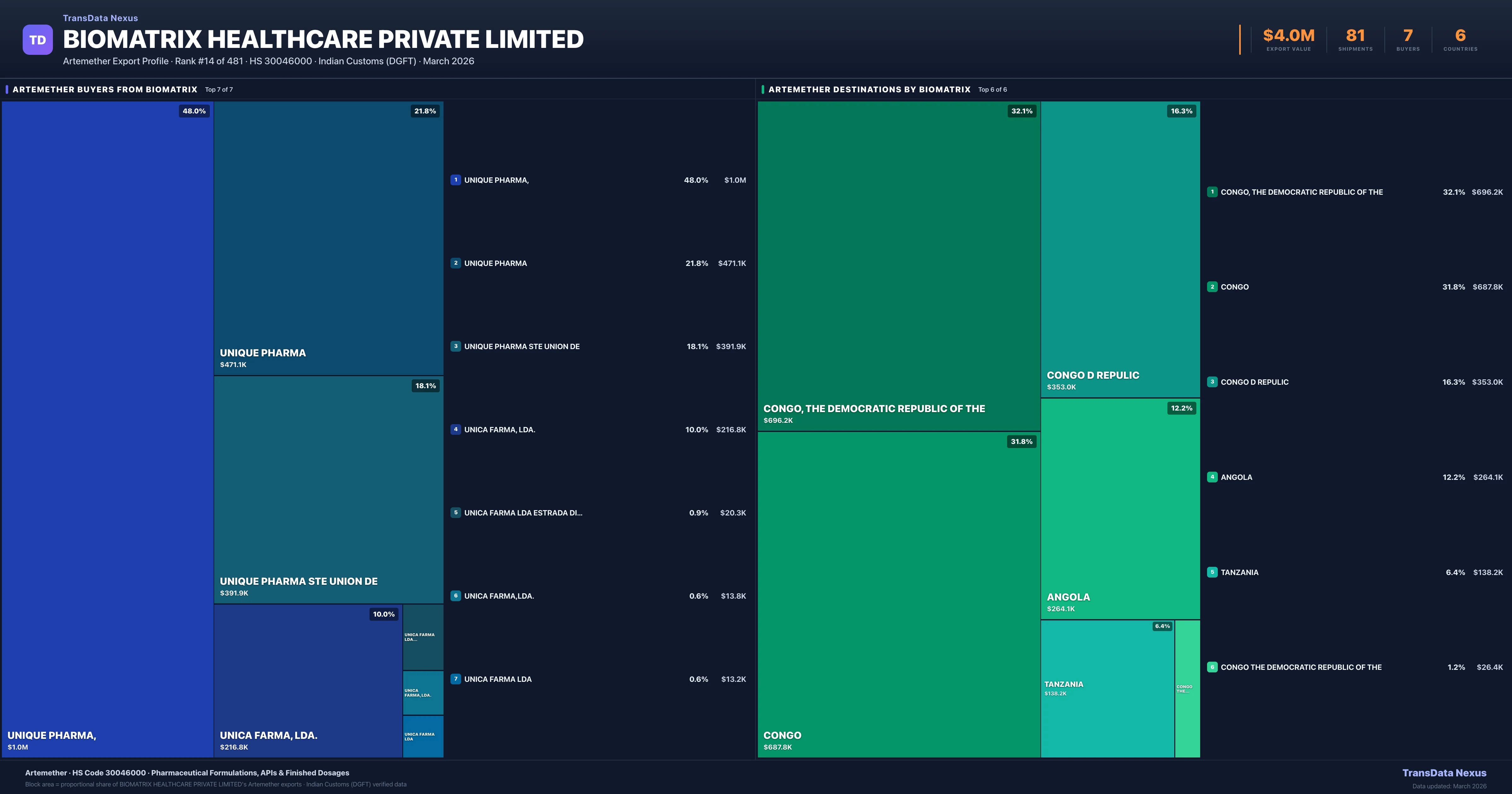 Biomatrix Healthcare Private Limited supplies Artemether to 7 buyers globally. The largest buyer is UNIQUE PHARMA, (CONGO, THE DEMOCRATIC REPUBLIC OF THE), followed by UNIQUE PHARMA (CONGO) and UNIQUE PHARMA STE UNION DE (CONGO). These buyers represent pharmaceutical distributors, hospital groups, and government procurement agencies in their respective markets.