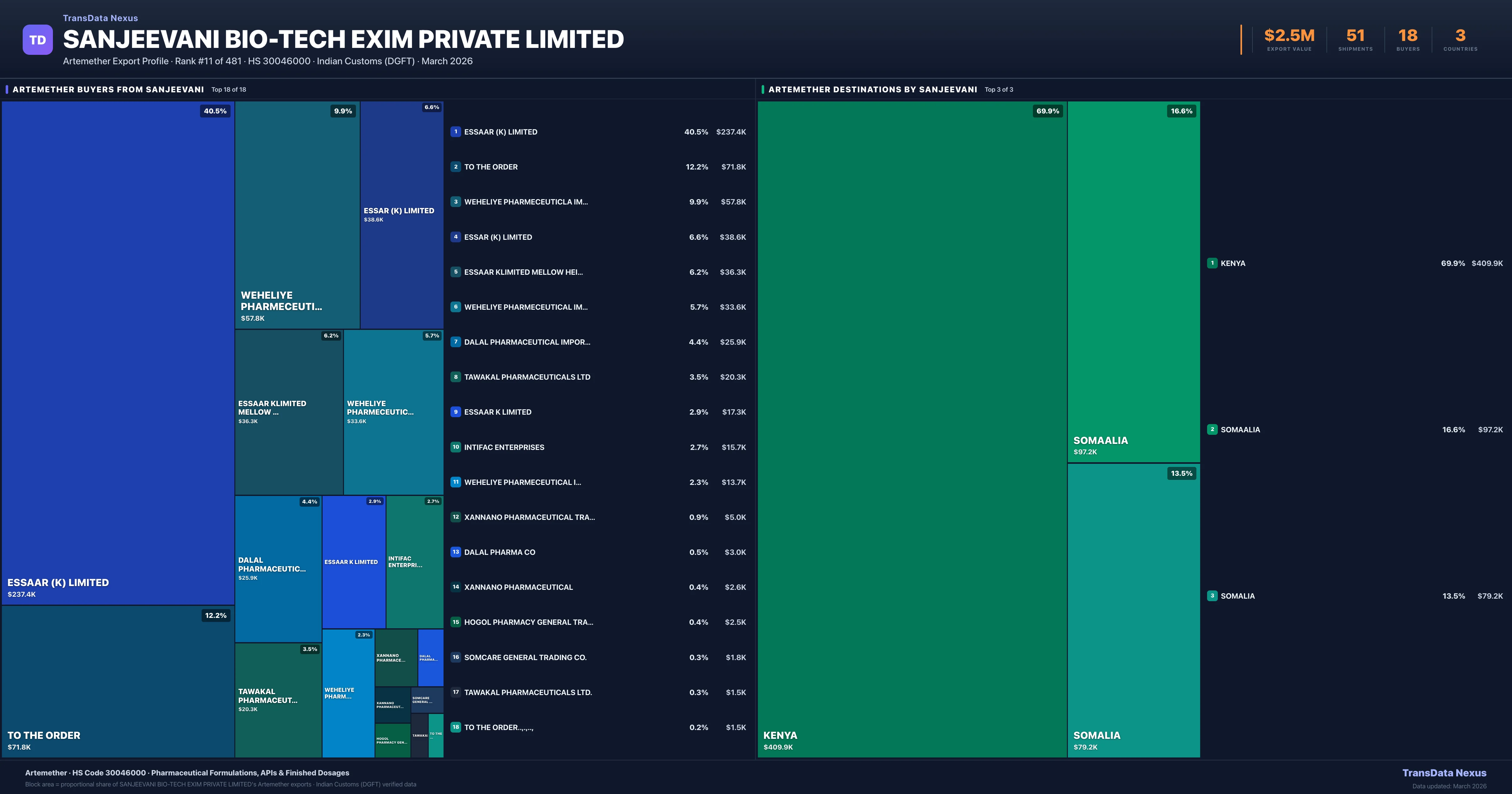 Sanjeevani Bio-tech Exim Private Limited supplies Artemether to 18 buyers globally. The largest buyer is ESSAAR (K) LIMITED (KENYA), followed by TO THE ORDER (SOMALIA) and WEHELIYE PHARMECEUTICLA IMPORT CO. (SOMAALIA). These buyers represent pharmaceutical distributors, hospital groups, and government procurement agencies in their respective markets.