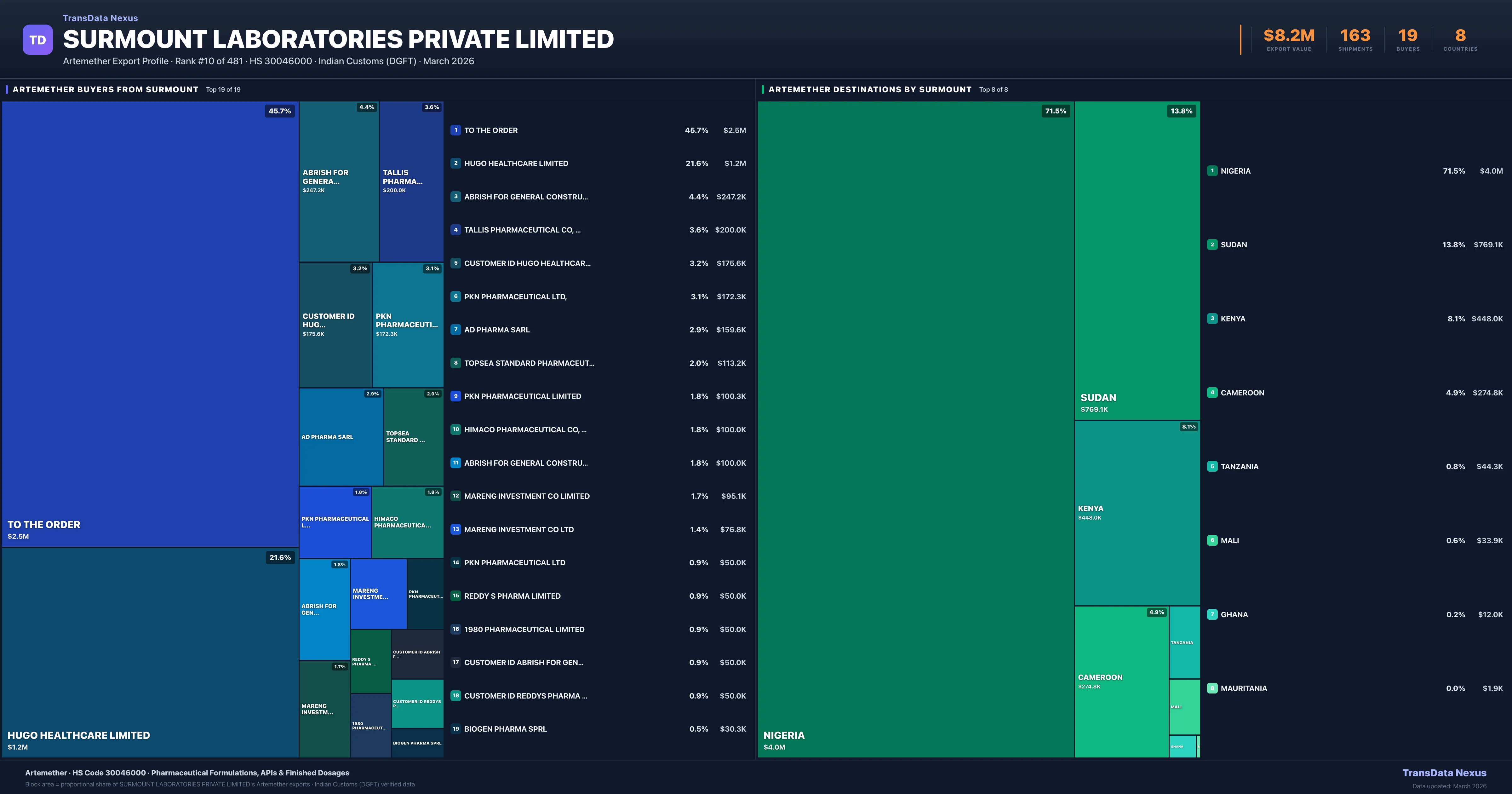 - 4.Verified Records: This page is backed by 164 individual customs records matching Surmount Laboratories Private Limited exporting Artemether, covering 66 formulations to 8 countries via 19 buyers.