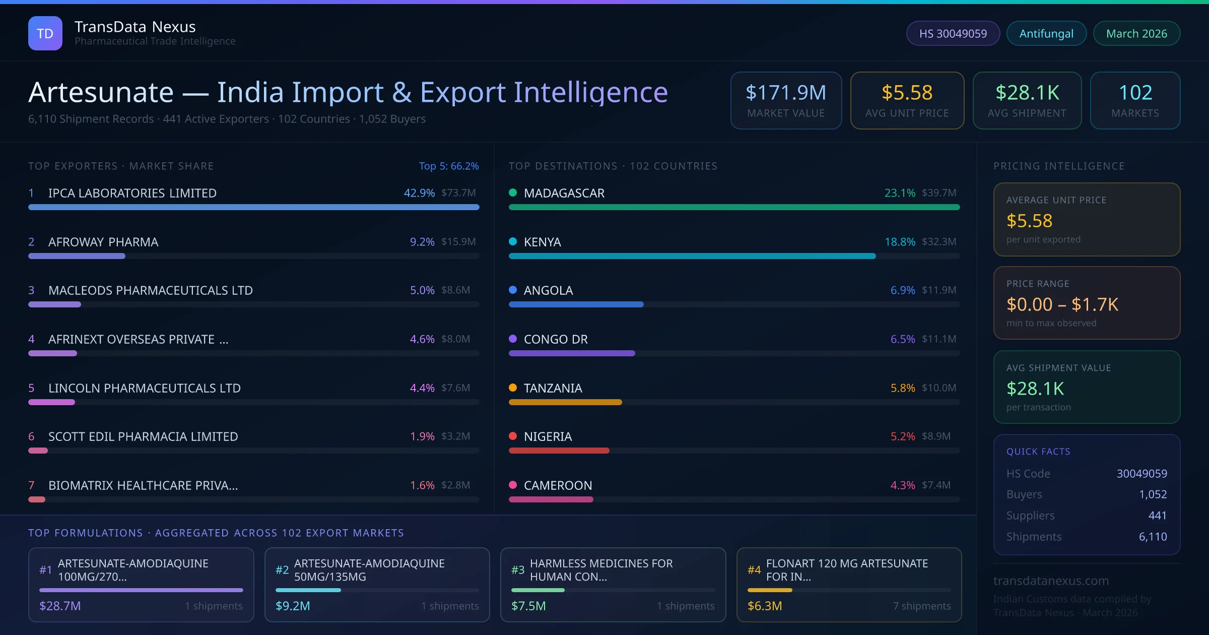 Between 2022 and 2026, India exported $171.9M worth of artesunate across 6,110 verified shipments to 102 countries — covering 52% of world markets in the Antimalarial & Antiparasitic segment. The largest destination is MADAGASCAR (23.1%). IPCA LABORATORIES LIMITED leads with a 42.9% share. All figures are drawn from Indian Customs (DGFT) shipping bill records spanning four years of trade activity.