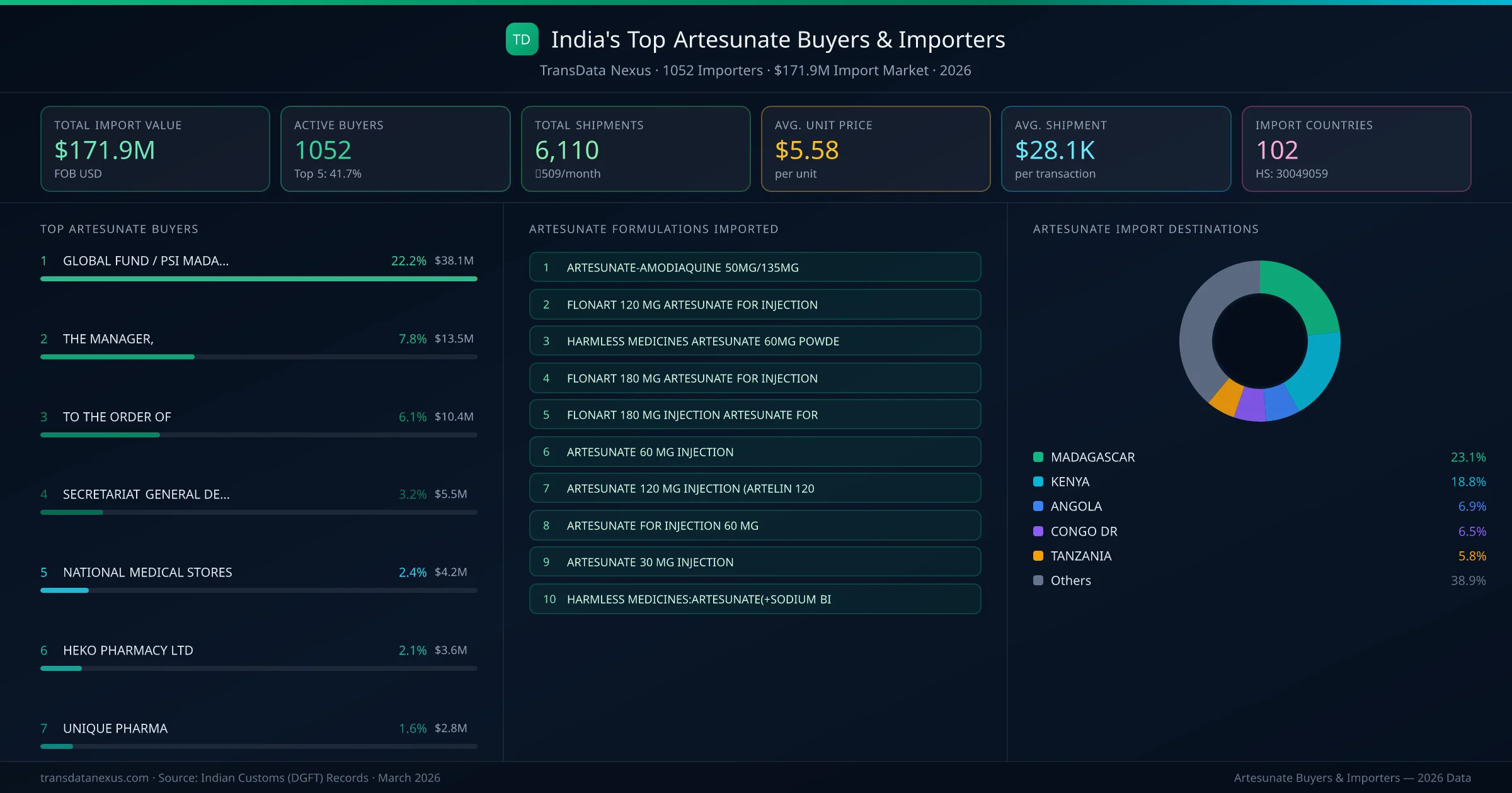 GLOBAL FUND / PSI MADAGASCAR (MADAGASCAR) is the leading artesunate importer from India, holding a 22.2% share of the $171.9M market across 6,110 shipments from 1052 buyers. The top 5 buyers — GLOBAL FUND / PSI MADAGASCAR (MADAGASCAR), SECRETARIAT GENERAL DE LA SANTE (CONGO DR), NATIONAL MEDICAL STORES (KENYA), HEKO PHARMACY LTD (TANZANIA), UNIQUE PHARMA (CONGO DR) — collectively control 31.6% of total import value.