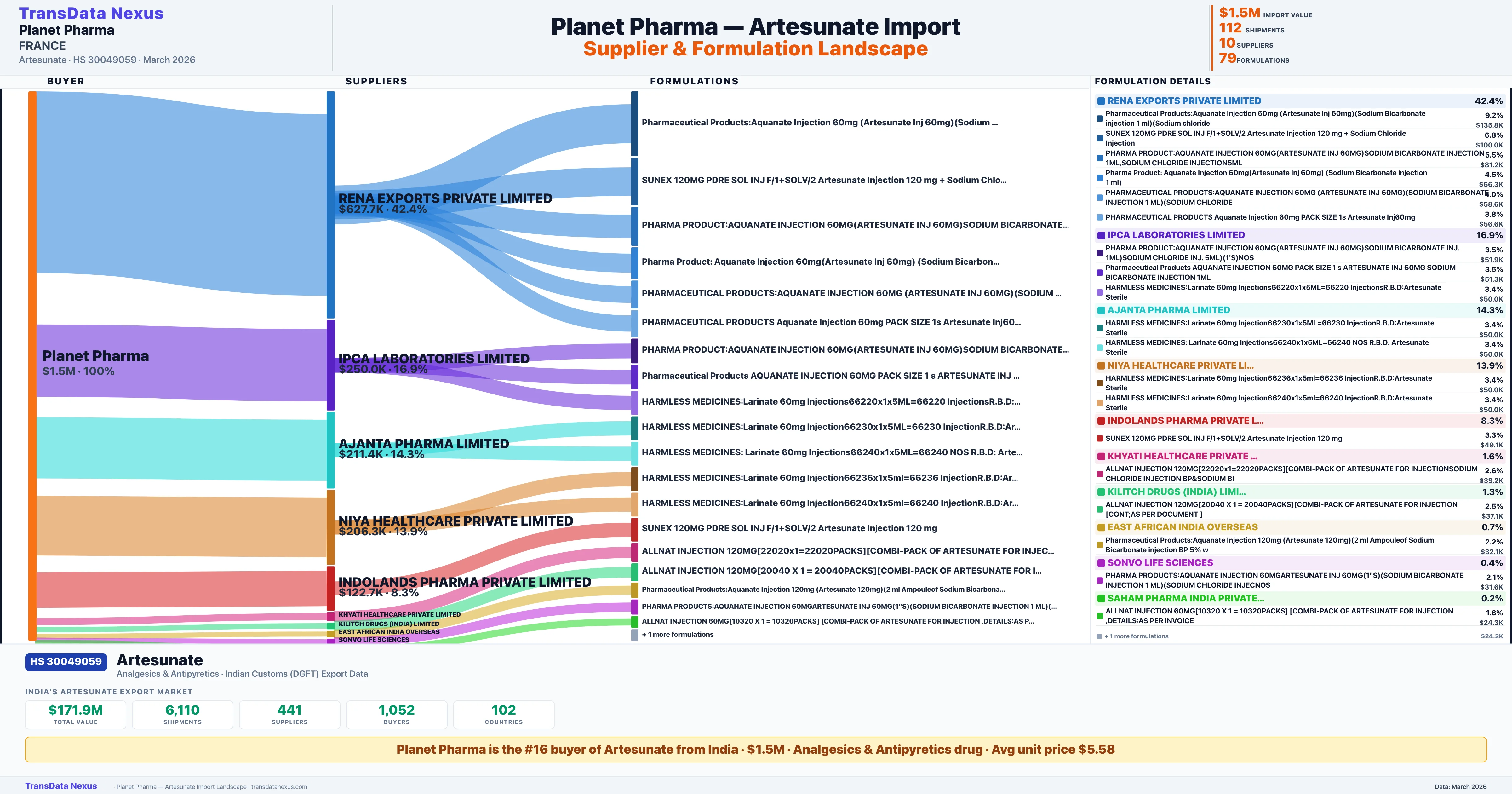 - 5.Verified Records: This page is backed by 112 individual customs records matching PLANET PHARMA importing Artesunate, covering 79 formulations from 10 verified suppliers.